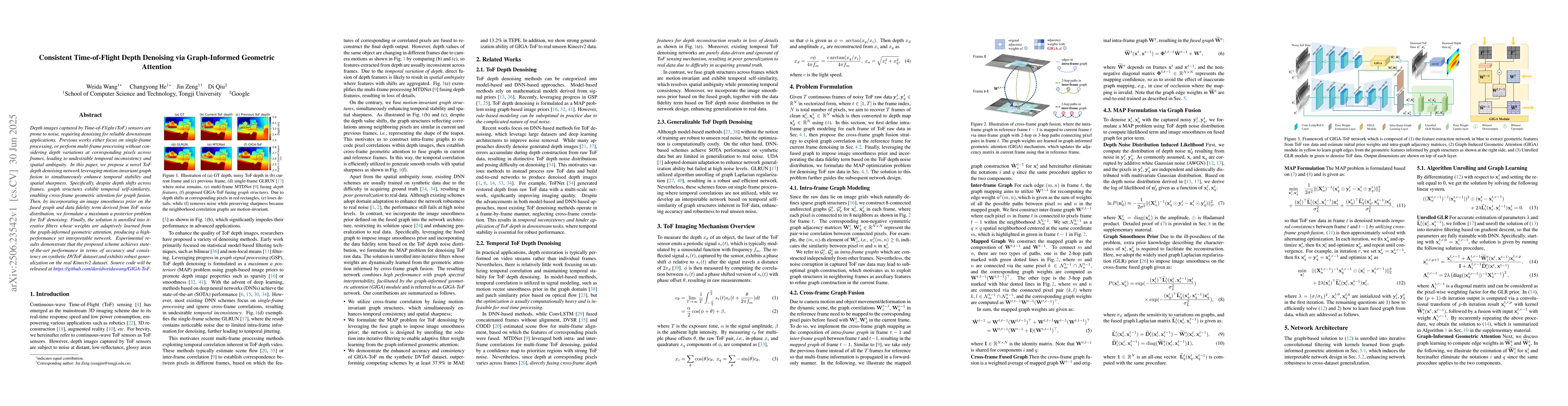 Depth images captured by Time-of-Flight (ToF) sensors are prone to noise, requiring denoising for reliable downstream applications. Previous works either focus on single-frame processing, or perform multi-frame processing without considering depth variations at corresponding pixels across frames, leading to undesirable temporal inconsistency and spatial ambiguity. In this paper, we propose a novel ToF depth denoising network leveraging motion-invariant graph fusion to simultaneously enhance temporal stability and spatial sharpness. Specifically, despite depth shifts across frames, graph structures exhibit temporal self-similarity, enabling cross-frame geometric attention for graph fusion. Then, by incorporating an image smoothness prior on the fused graph and data fidelity term derived from ToF noise distribution, we formulate a maximum a posterior problem for ToF denoising. Finally, the solution is unrolled into iterative filters whose weights are adaptively learned from the graph-informed geometric attention, producing a high-performance yet interpretable network. Experimental results demonstrate that the proposed scheme achieves state-of-the-art performance in terms of accuracy and consistency on synthetic DVToF dataset and exhibits robust generalization on the real Kinectv2 dataset. Source code will be released at \href{https://github.com/davidweidawang/GIGA-ToF}{https://github.com/davidweidawang/GIGA-ToF}.