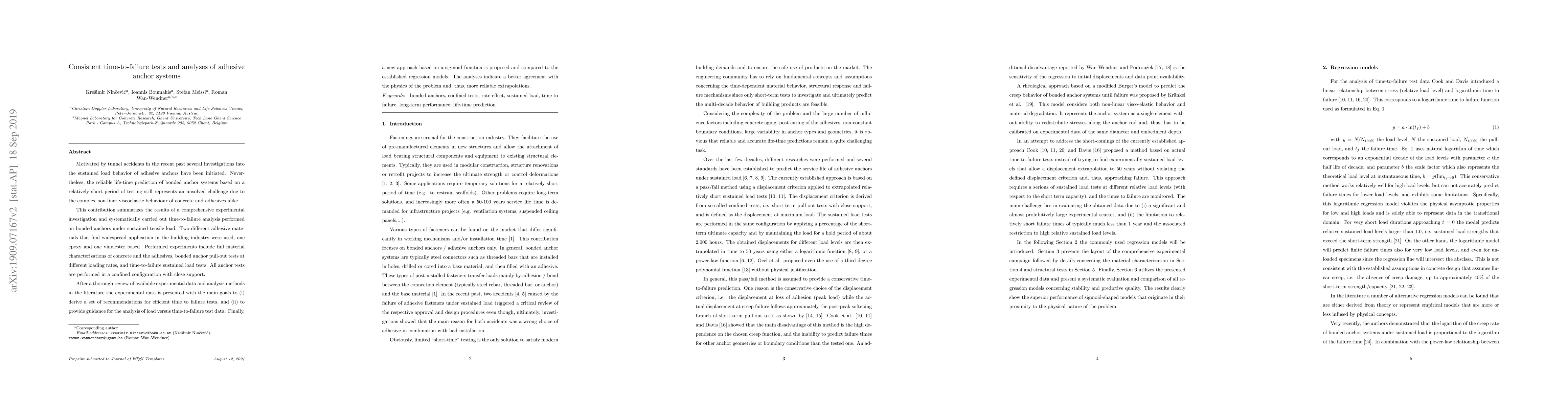 This paper investigates the sustained load behavior of adhesive anchors through comprehensive experimental tests and time-to-failure analyses. The study proposes a new sigmoid function approach for better prediction of anchor failure times, showing improved agreement with the underlying physics compared to established regression models.