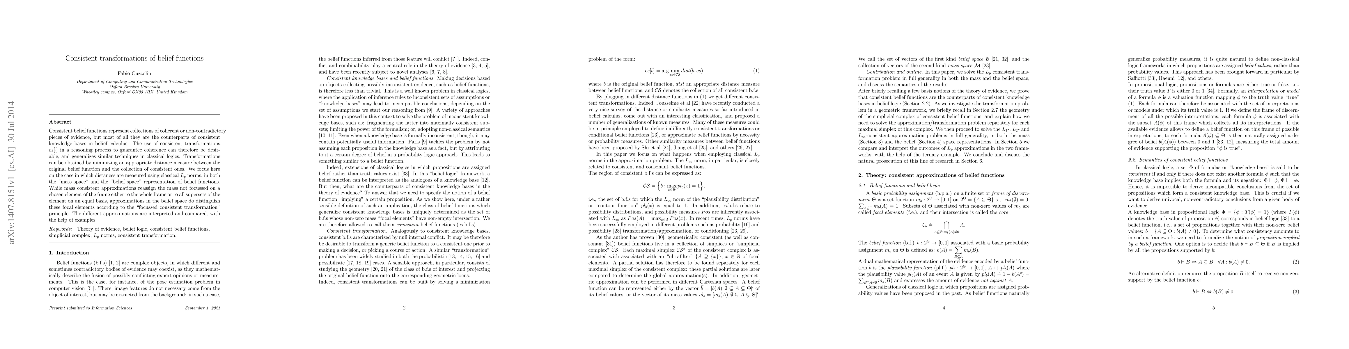 This paper explores consistent transformations of belief functions to ensure coherence, analogous to consistent knowledge bases in belief calculus. The study focuses on minimizing Lp norm distances to derive these transformations, comparing mass consistent approximations and belief space approximations under the "focussed consistent transformation" principle.