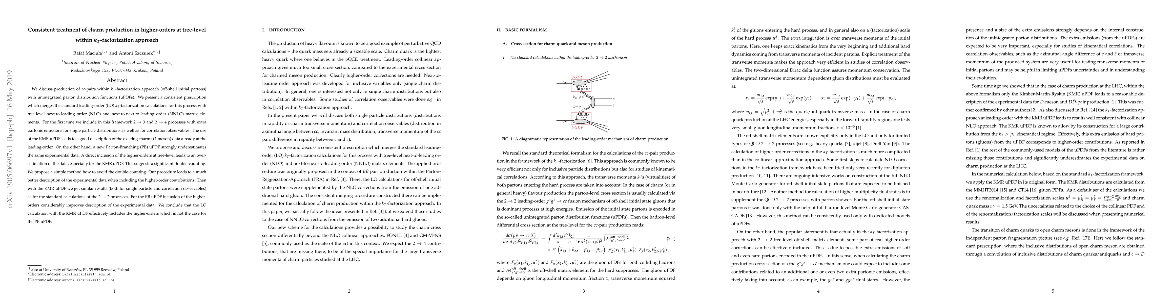 We discuss production of $c \bar c$-pairs within $k_T$-factorization approach (off-shell initial partons) with unintegrated parton distribution functions (uPDFs). We present a consistent prescription which merges the standard leading-order (LO) $k_T$-factorization calculations for this process with tree-level next-to-leading order (NLO) and next-to-next-to-leading order (NNLO) matrix elements. For the first time we include in this framework 2 $\to$ 3 and 2 $\to$ 4 processes with extra partonic emissions for single particle distributions as well as for correlation observables. The use of the KMR uPDF leads to a good description of the existing charm ($D$-meson) data already at the leading-order. On the other hand, a new Parton-Branching (PB) uPDF strongly underestimates the same experimental data. A direct inclusion of the higher-orders at tree-level leads to an overestimation of the data, especially for the KMR uPDF. This suggests a significant double-counting. We propose a simple method how to avoid the double-counting. Our procedure leads to a much better description of the experimental data when including the higher-order contributions. Then with the KMR uPDF we get similar results (both for single particle and correlation observables) as for the standard calculations of the 2 $\to$ 2 processes. For the PB uPDF inclusion of the higher-orders considerably improves description of the experimental data. We conclude that the LO calculation with the KMR uPDF effectively includes the higher-orders which is not the case for the PB uPDF.