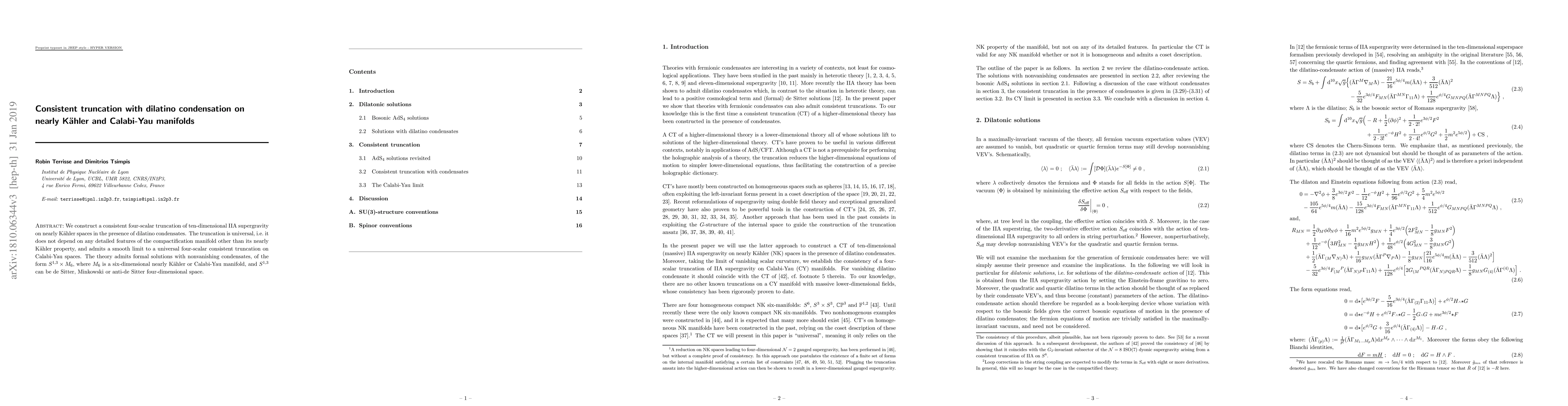 This paper constructs a universal four-scalar truncation of ten-dimensional IIA supergravity on nearly Kähler spaces with dilatino condensates, which smoothly limits to a similar truncation on Calabi-Yau manifolds. The theory accommodates solutions with nonvanishing condensates on six-dimensional nearly Kähler or Calabi-Yau manifolds within a four-dimensional space that can be de Sitter, Minkowski, or anti-de Sitter.