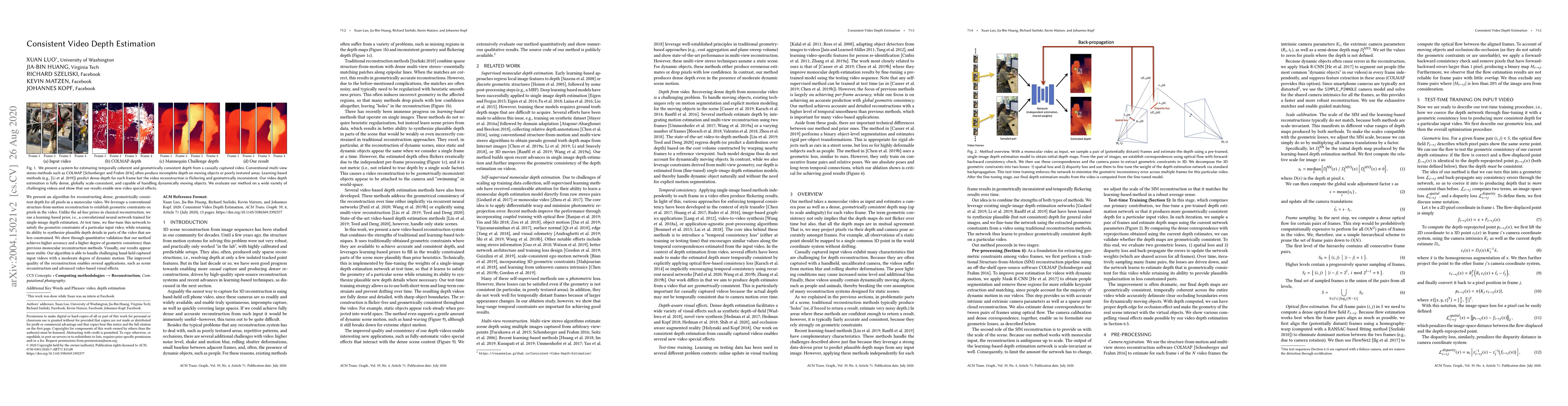 This paper introduces an algorithm for generating dense, geometrically consistent depth maps for monocular videos by combining structure-from-motion with a convolutional neural network trained on single-image depth estimation, achieving higher accuracy and stability compared to previous methods.