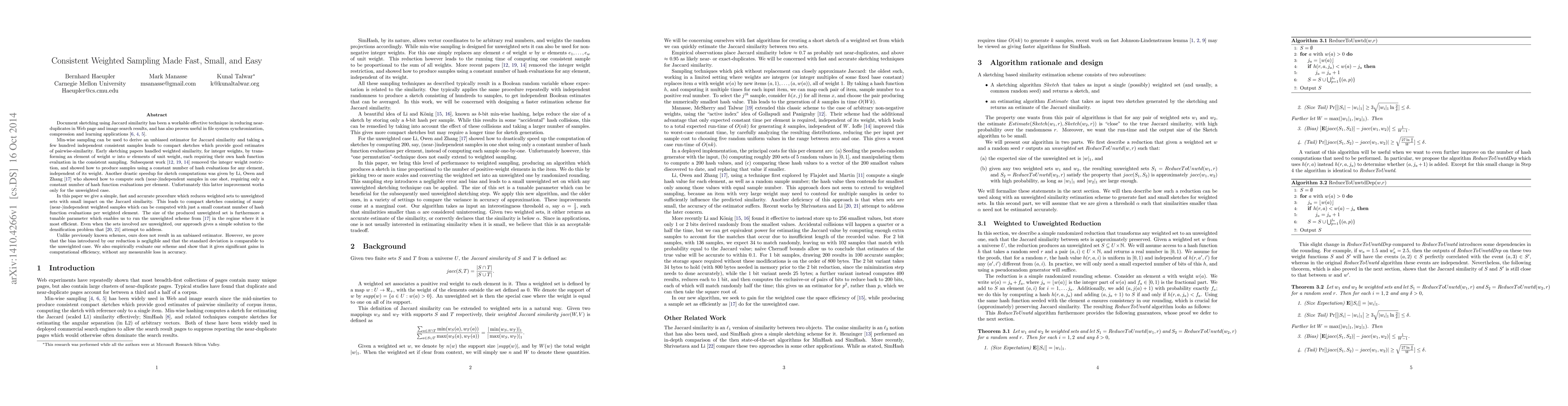 Document sketching using Jaccard similarity has been a workable effective technique in reducing near-duplicates in Web page and image search results, and has also proven useful in file system synchronization, compression and learning applications. Min-wise sampling can be used to derive an unbiased estimator for Jaccard similarity and taking a few hundred independent consistent samples leads to compact sketches which provide good estimates of pairwise-similarity. Subsequent works extended this technique to weighted sets and show how to produce samples with only a constant number of hash evaluations for any element, independent of its weight. Another improvement by Li et al. shows how to speedup sketch computations by computing many (near-)independent samples in one shot. Unfortunately this latter improvement works only for the unweighted case. In this paper we give a simple, fast and accurate procedure which reduces weighted sets to unweighted sets with small impact on the Jaccard similarity. This leads to compact sketches consisting of many (near-)independent weighted samples which can be computed with just a small constant number of hash function evaluations per weighted element. The size of the produced unweighted set is furthermore a tunable parameter which enables us to run the unweighted scheme of Li et al. in the regime where it is most efficient. Even when the sets involved are unweighted, our approach gives a simple solution to the densification problem that other works attempted to address. Unlike previously known schemes, ours does not result in an unbiased estimator. However, we prove that the bias introduced by our reduction is negligible and that the standard deviation is comparable to the unweighted case. We also empirically evaluate our scheme and show that it gives significant gains in computational efficiency, without any measurable loss in accuracy.