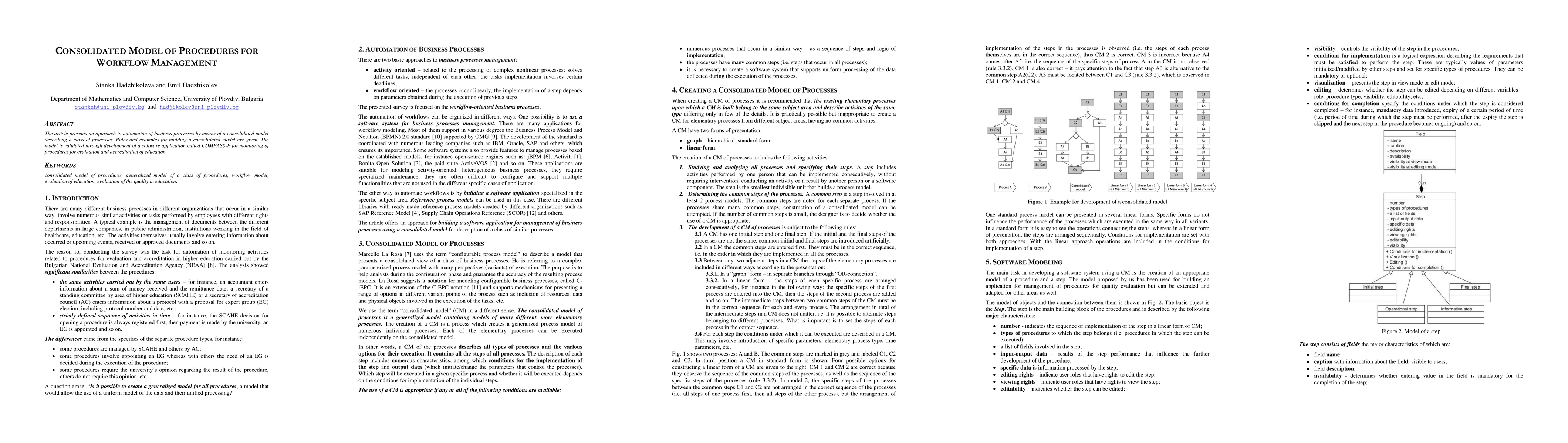 The article presents an approach to automation of business processes by means of a consolidated model describing a class of processes. Rules and examples for building a consolidated model are given. The model is validated through development of a software application called COMPASS-P for monitoring of procedures for evaluation and accreditation of education.