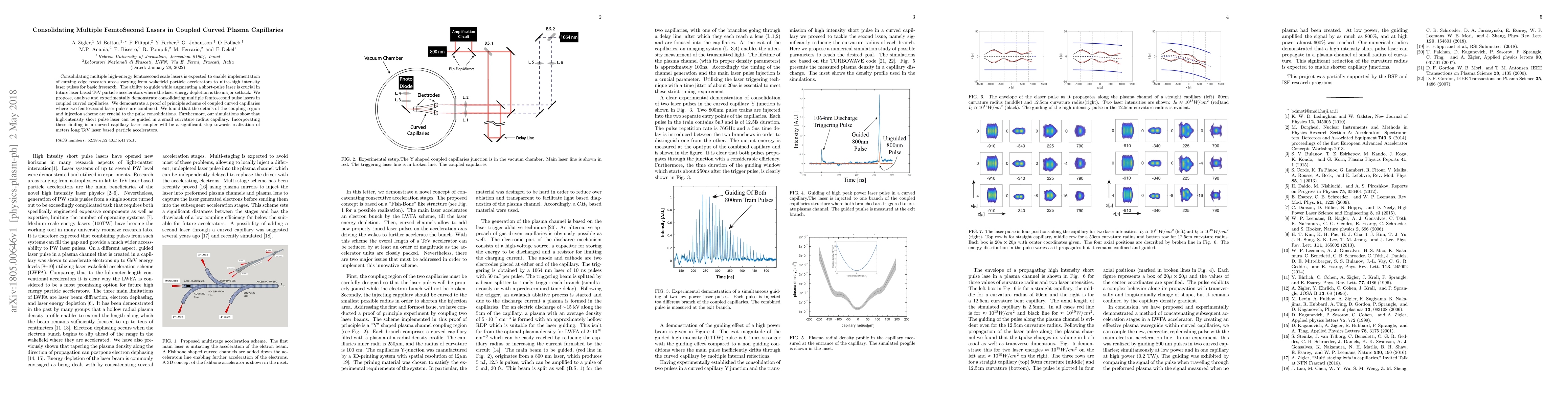 Consolidating multiple high-energy femtosecond scale lasers is expected to enable implementation of cutting edge research areas varying from wakefield particle accelerators to ultra-high intensity laser pulses for basic fresearch. The ability to guide while augmenting a short-pulse laser is crucial in future laser based TeV particle accelerators where the laser energy depletion is the major setback. We propose, analyze and experimentally demonstrate consolidating multiple femtosecond pulse lasers in coupled curved capillaries. We demonstrate a proof of principle scheme of coupled curved capillaries where two femtosecond laser pulses are combined. We found that the details of the coupling region and injection scheme are crucial to the pulse consolidations. Furthermore, our simulations show that high-intensity short pulse laser can be guided in a small curvature radius capillary. Incorporating these finding in a curved capillary laser coupler will be a significant step towards realization of meters long TeV laser based particle accelerators.