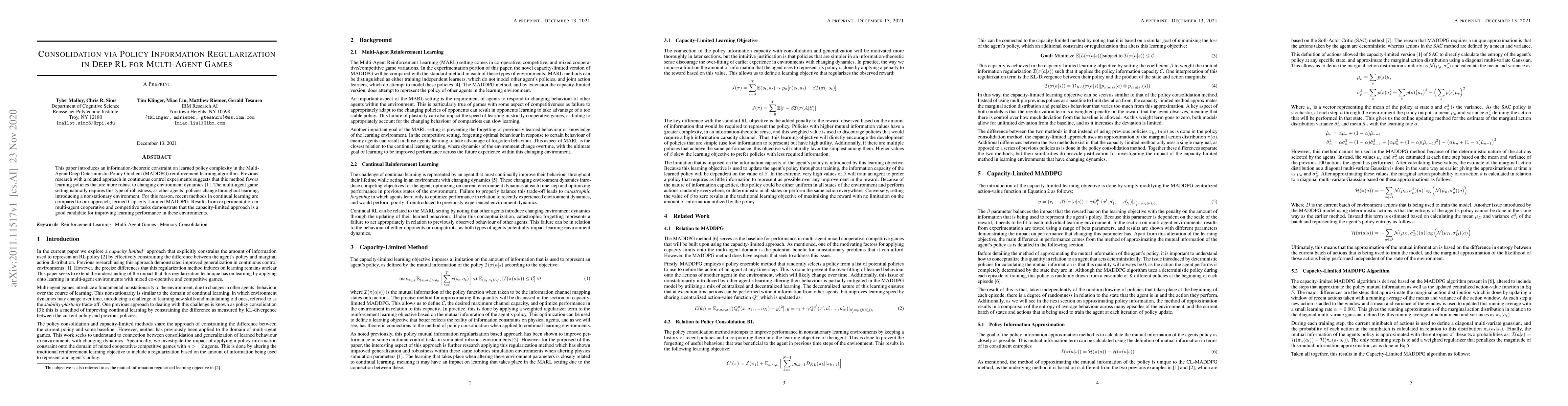 This paper introduces an information-theoretic constraint on learned policy complexity in the Multi-Agent Deep Deterministic Policy Gradient (MADDPG) reinforcement learning algorithm. Previous research with a related approach in continuous control experiments suggests that this method favors learning policies that are more robust to changing environment dynamics. The multi-agent game setting naturally requires this type of robustness, as other agents' policies change throughout learning, introducing a nonstationary environment. For this reason, recent methods in continual learning are compared to our approach, termed Capacity-Limited MADDPG. Results from experimentation in multi-agent cooperative and competitive tasks demonstrate that the capacity-limited approach is a good candidate for improving learning performance in these environments.