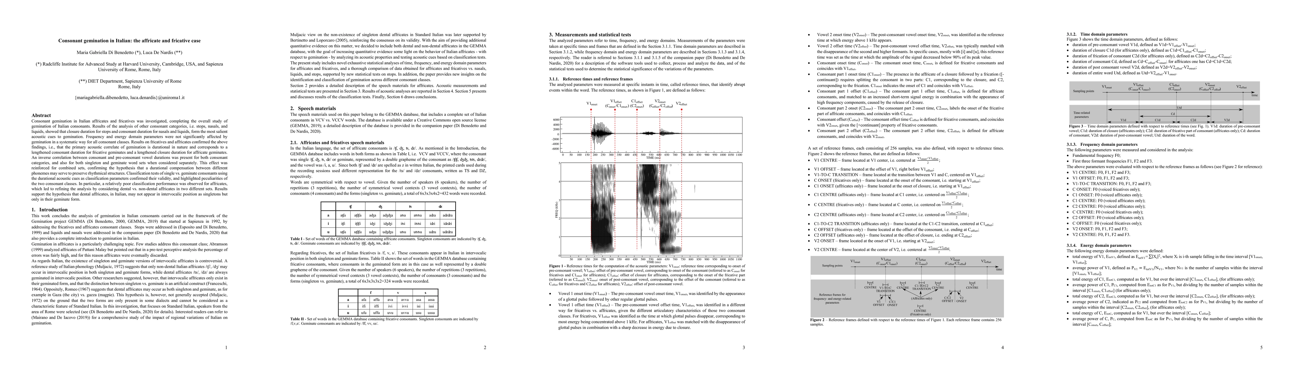 Consonant gemination in Italian affricates and fricatives was investigated, completing the overall study of gemination of Italian consonants. Results of the analysis of other consonant categories, i.e. stops, nasals, and liquids, showed that closure duration for stops and consonant duration for nasals and liquids, form the most salient acoustic cues to gemination. Frequency and energy domain parameters were not significantly affected by gemination in a systematic way for all consonant classes. Results on fricatives and affricates confirmed the above findings, i.e., that the primary acoustic correlate of gemination is durational in nature and corresponds to a lengthened consonant duration for fricative geminates and a lengthened closure duration for affricate geminates. An inverse correlation between consonant and pre-consonant vowel durations was present for both consonant categories, and also for both singleton and geminate word sets when considered separately. This effect was reinforced for combined sets, confirming the hypothesis that a durational compensation between different phonemes may serve to preserve rhythmical structures. Classification tests of single vs. geminate consonants using the durational acoustic cues as classification parameters confirmed their validity, and highlighted peculiarities of the two consonant classes. In particular, a relatively poor classification performance was observed for affricates, which led to refining the analysis by considering dental vs. non-dental affricates in two different sets. Results support the hypothesis that dental affricates, in Italian, may not appear in intervocalic position as singletons but only in their geminate form.