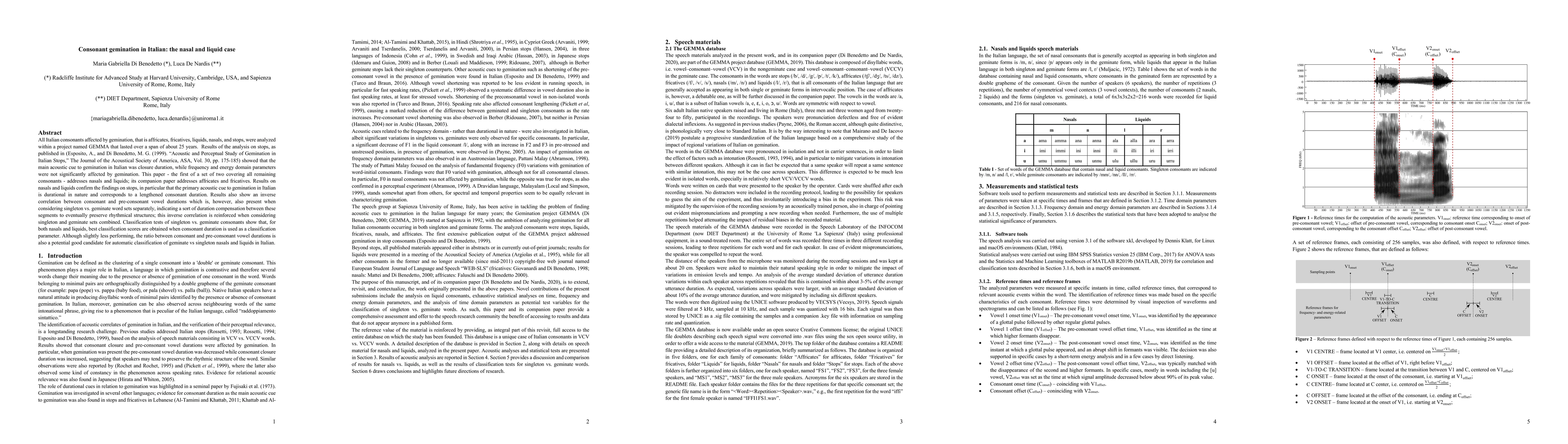 All Italian consonants affected by gemination, that is affricates, fricatives, liquids, nasals, and stops, were analyzed within a project named GEMMA that lasted over a span of about 25 years. Results of the analysis on stops, as published in (Esposito, A., and Di Benedetto, M. G. (1999). "Acoustic and Perceptual Study of Gemination in Italian Stops," The Journal of the Acoustical Society of America, ASA, Vol. 30, pp. 175-185) showed that the main acoustic cue to gemination in Italian was closure duration, while frequency and energy domain parameters were not significantly affected by gemination. This paper - the first of a set of two covering all remaining consonants - addresses nasals and liquids; its companion paper addresses affricates and fricatives. Results on nasals and liquids confirm the findings on stops, in particular that the primary acoustic cue to gemination in Italian is durational in nature and corresponds to a lengthened consonant duration. Results also show an inverse correlation between consonant and pre-consonant vowel durations which is, however, also present when considering singleton vs. geminate word sets separately, indicating a sort of duration compensation between these segments to eventually preserve rhythmical structures; this inverse correlation is reinforced when considering singleton and geminate sets combined. Classification tests of singleton vs. geminate consonants show that, for both nasals and liquids, best classification scores are obtained when consonant duration is used as a classification parameter. Although slightly less performing, the ratio between consonant and pre-consonant vowel durations is also a potential good candidate for automatic classification of geminate vs singleton nasals and liquids in Italian.