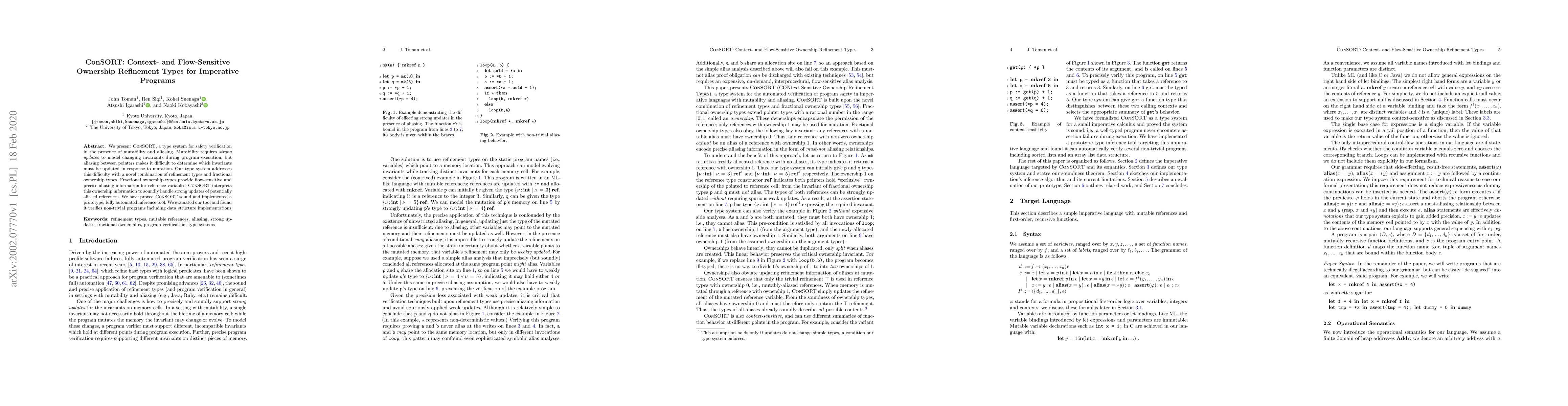 ConSORT introduces a type system combining refinement and fractional ownership types to manage mutability and aliasing in imperative programs, ensuring precise aliasing information and sound updates. The prototype tool successfully verifies non-trivial programs, demonstrating its practical effectiveness.