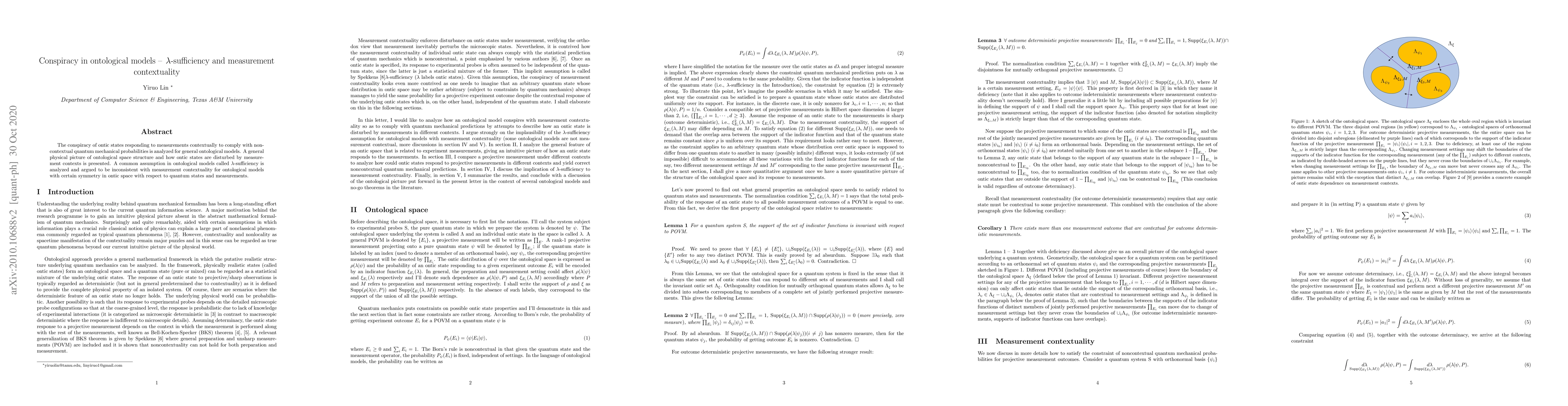 The paper presents a detailed analysis of the inconsistency between lambda-sufficiency and measurement contextuality in ontological models, proposing new lemmas and a corollary to describe the properties of ontological spaces.
