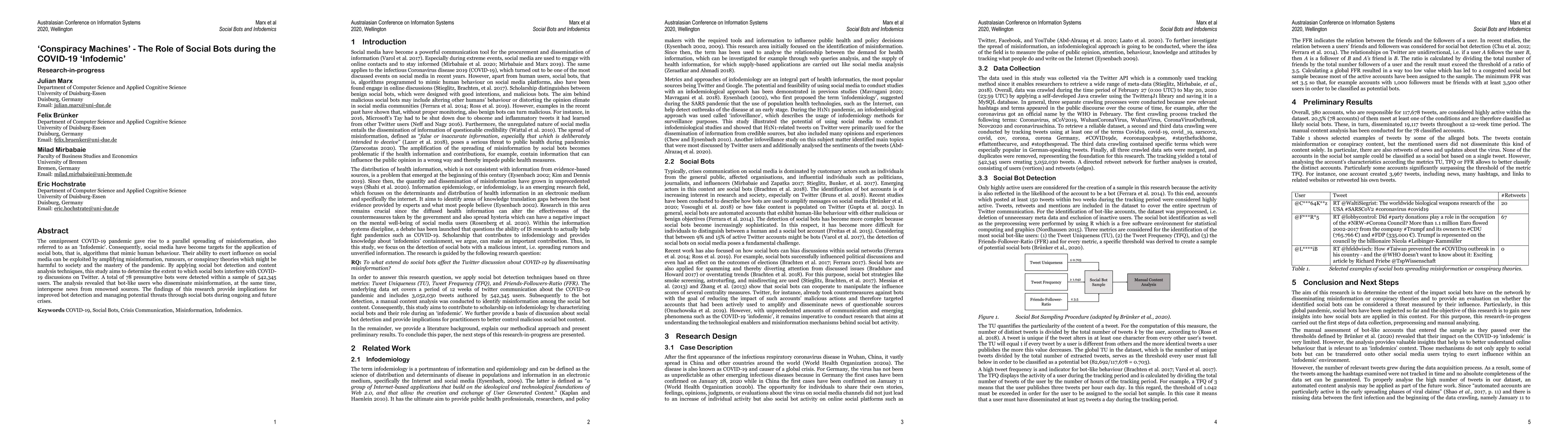 The omnipresent COVID-19 pandemic gave rise to a parallel spreading of misinformation, also referred to as an Infodemic. Consequently, social media have become targets for the application of social bots, that is, algorithms that mimic human behaviour. Their ability to exert influence on social media can be exploited by amplifying misinformation, rumours, or conspiracy theories which might be harmful to society and the mastery of the pandemic. By applying social bot detection and content analysis techniques, this study aims to determine the extent to which social bots interfere with COVID- 19 discussions on Twitter. A total of 78 presumptive bots were detected within a sample of 542,345 users. The analysis revealed that bot-like users who disseminate misinformation, at the same time, intersperse news from renowned sources. The findings of this research provide implications for improved bot detection and managing potential threats through social bots during ongoing and future crises.