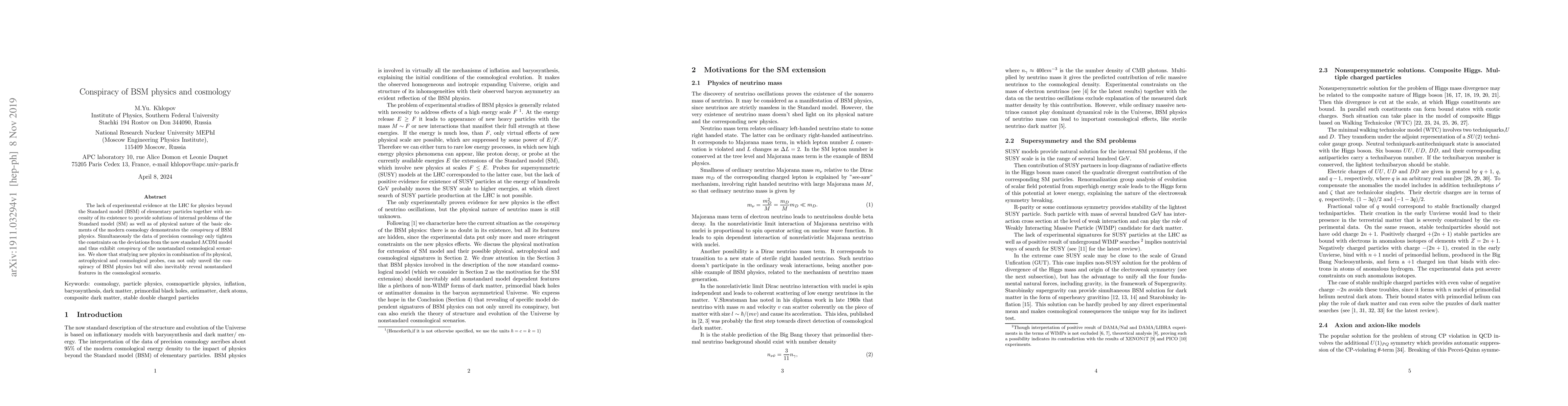 The lack of experimental evidence at the LHC for physics beyond the Standard model (BSM) of elementary particles together with necessity of its existence to provide solutions of internal problems of the Standard model (SM) as well as of physical nature of the basic elements of the modern cosmology demonstrates the conspiracy of BSM physics. Simultaneously the data of precision cosmology only tighten the constraints on the deviations from the now standard LambdaCDM model and thus exhibit conspiracy of the nonstandard cosmological scenarios. We show that studying new physics in combination of its physical, astrophysical and cosmological probes, can not only unveil the conspiracy of BSM physics but will also inevitably reveal nonstandard features in the cosmological scenario.