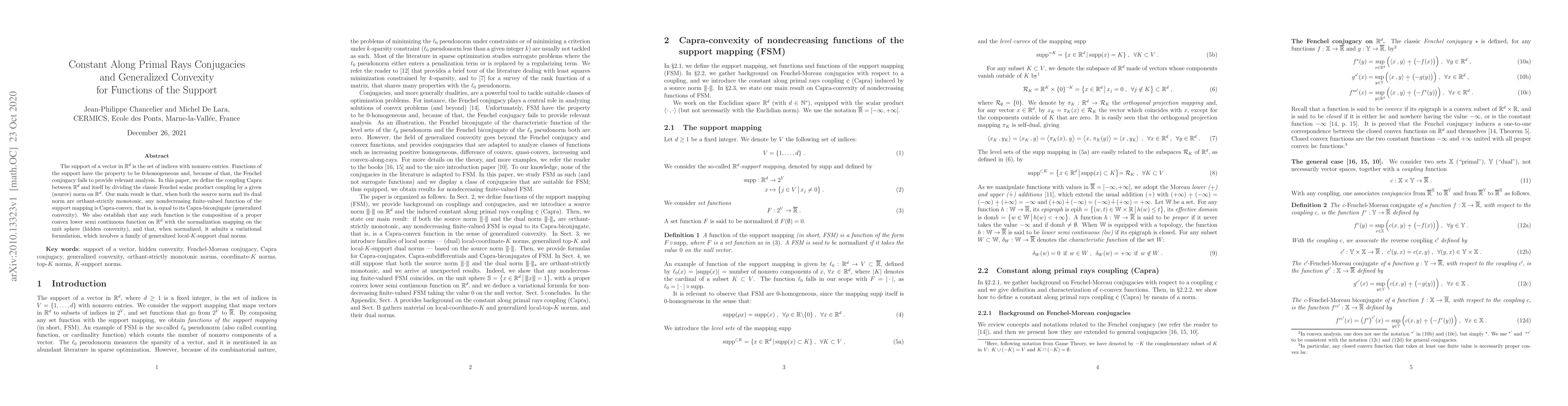 The support of a vector in R d is the set of indices with nonzero entries. Functions of the support have the property to be 0-homogeneous and, because of that, the Fenchel conjugacy fails to provide relevant analysis. In this paper, we define the coupling Capra between R d and itself by dividing the classic Fenchel scalar product coupling by a given (source) norm on R d. Our main result is that, when both the source norm and its dual norm are orthant-strictly monotonic, any nondecreasing finite-valued function of the support mapping is Capra-convex, that is, is equal to its Capra-biconjugate (generalized convexity). We also establish that any such function is the composition of a proper convex lower semi continuous function on R d with the normalization mapping on the unit sphere (hidden convexity), and that, when normalized, it admits a variational formulation, which involves a family of generalized local-K-support dual norms.