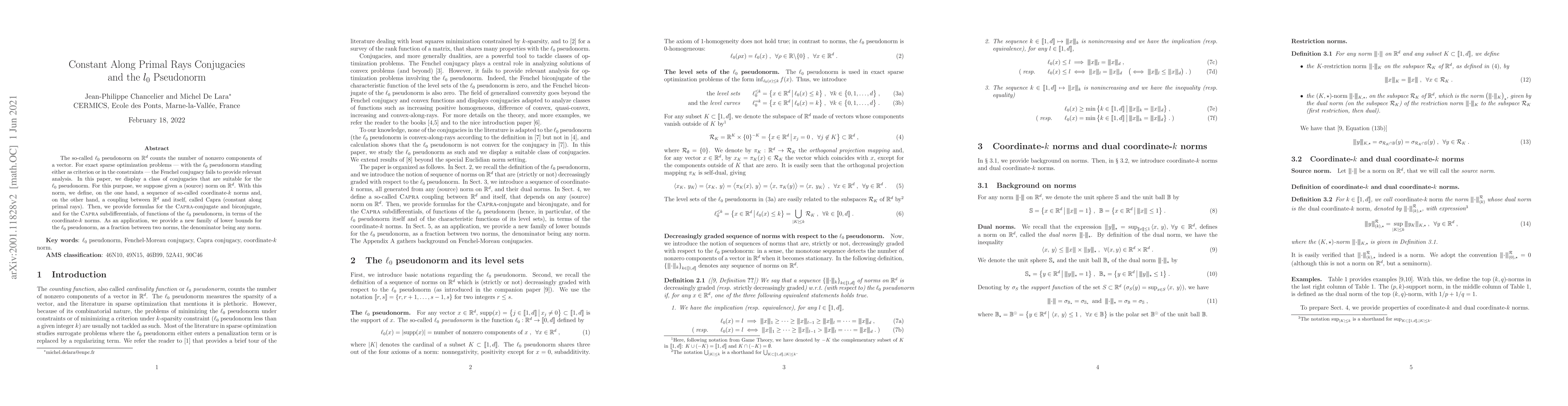 The so-called l0 pseudonorm on Rd counts the number of nonzero components of a vector. It is used in sparse optimization, either as criterion or in the constraints, to obtain solutions with few nonzero entries. For such problems, the Fenchel conjugacy fails to provide relevant analysis: indeed, the Fenchel conjugate of the characteristic function of the level sets of the l0 pseudonorm is minus infinity, and the Fenchel biconjugate of the l0 pseudonorm is zero. In this paper, we display a class of conjugacies that are suitable for the l0 pseudonorm. For this purpose, we suppose given a (source) norm on Rd. With this norm, we define, on the one hand, a sequence of so-called coordinate-k norms and, on the other hand, a coupling between Rd and Rd , called Capra (constant along primal rays). Then, we provide formulas for the Capra-conjugate and biconjugate, and for the Capra subdifferentials, of functions of the l0 pseudonorm (hence, in particular, of the l0 pseudonorm itself and of the characteristic functions of its level sets), in terms of the coordinate-k norms. As an application, we provide a new family of lower bounds for the l0 pseudonorm, as a fraction between two norms, the denominator being any norm.