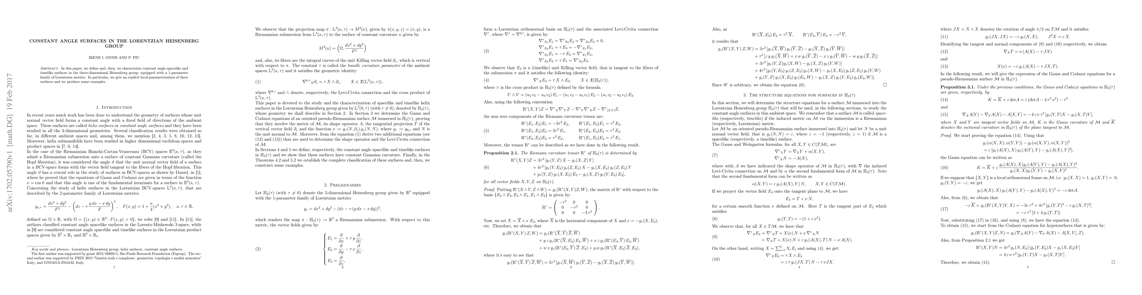 This paper defines and characterizes constant angle spacelike and timelike surfaces in the three-dimensional Heisenberg group under a Lorentzian metric, providing explicit local parametrizations and examples of these surfaces.