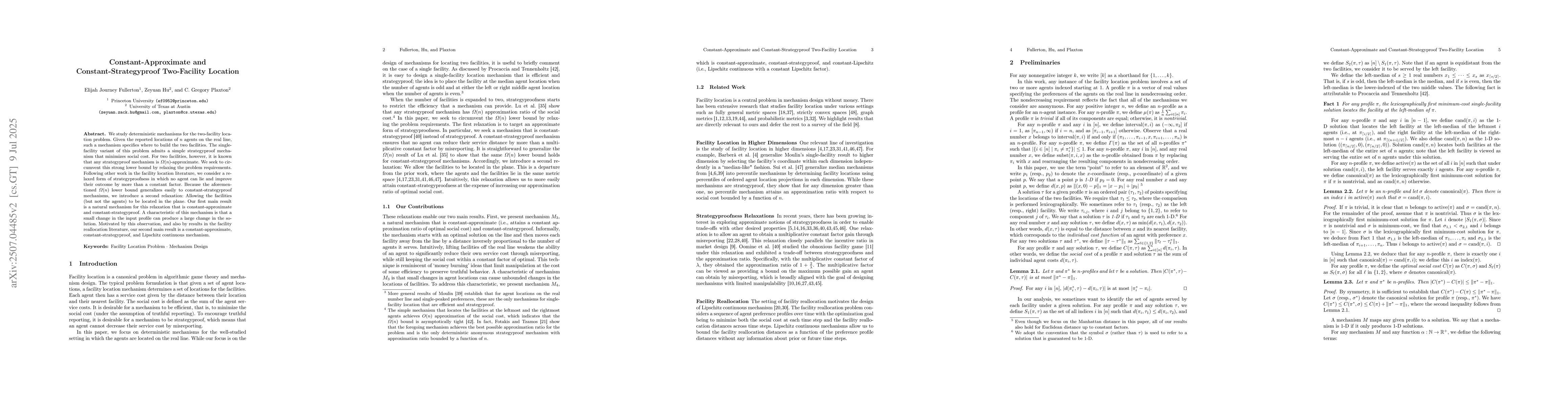 We study deterministic mechanisms for the two-facility location problem. Given the reported locations of n agents on the real line, such a mechanism specifies where to build the two facilities. The single-facility variant of this problem admits a simple strategyproof mechanism that minimizes social cost. For two facilities, however, it is known that any strategyproof mechanism is $\Omega(n)$-approximate. We seek to circumvent this strong lower bound by relaxing the problem requirements. Following other work in the facility location literature, we consider a relaxed form of strategyproofness in which no agent can lie and improve their outcome by more than a constant factor. Because the aforementioned $\Omega(n)$ lower bound generalizes easily to constant-strategyproof mechanisms, we introduce a second relaxation: Allowing the facilities (but not the agents) to be located in the plane. Our first main result is a natural mechanism for this relaxation that is constant-approximate and constant-strategyproof. A characteristic of this mechanism is that a small change in the input profile can produce a large change in the solution. Motivated by this observation, and also by results in the facility reallocation literature, our second main result is a constant-approximate, constant-strategyproof, and Lipschitz continuous mechanism.