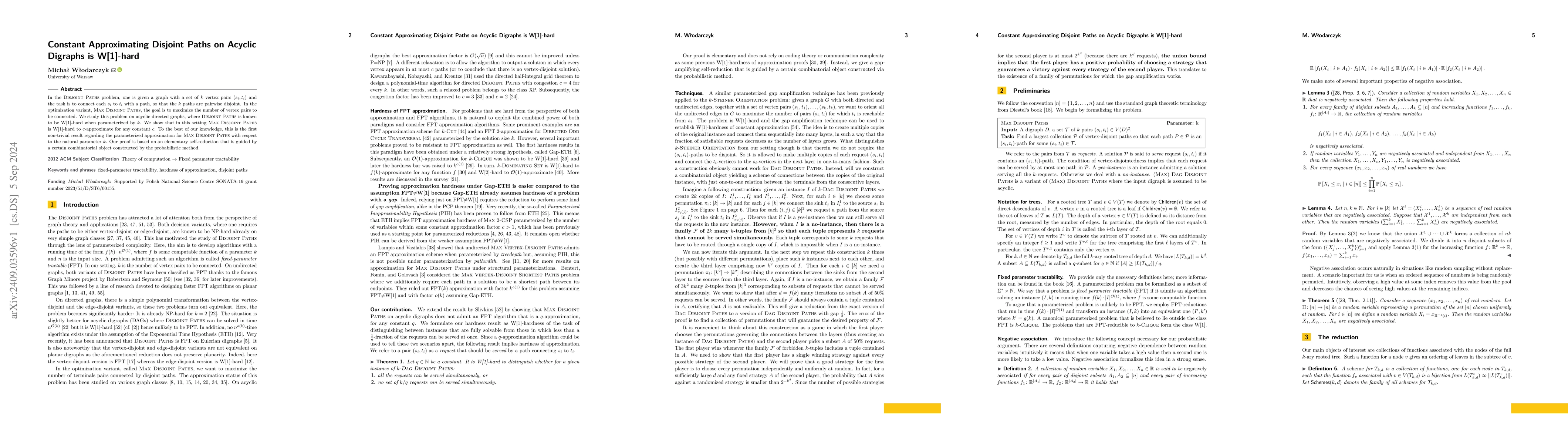 This paper proves that approximating the Max Disjoint Paths problem on acyclic directed graphs (DAGs) within any constant factor is W[1]-hard, extending the established W[1]-hardness of the decision version when parameterized by the number of vertex pairs $k$. The proof employs a self-reduction and combinatorial constructs via the probabilistic method.