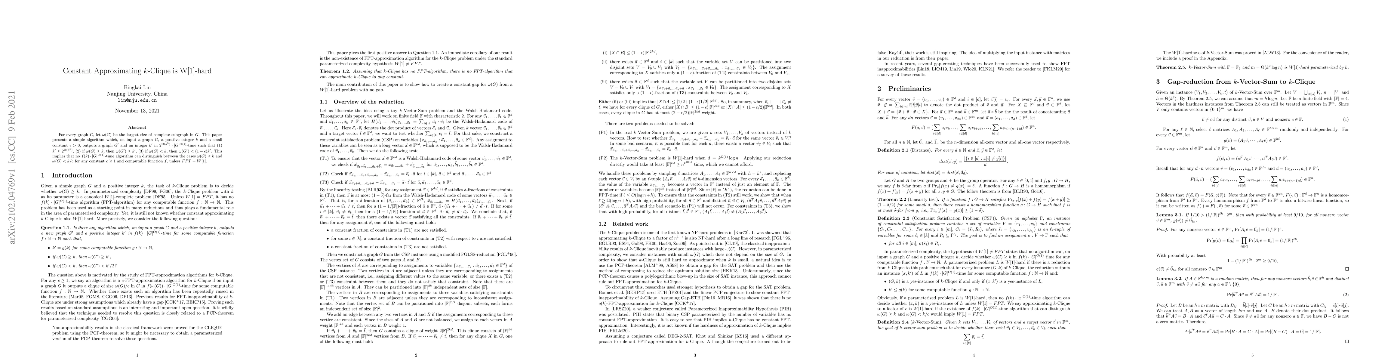 This paper demonstrates that approximating the size of the largest complete subgraph (k-Clique) within a constant factor is W[1]-hard, implying no efficient algorithm can distinguish between graphs with large and small k-Clique sizes unless FPT equals W[1]. The result is shown through a reduction algorithm that transforms input graphs to maintain k-Clique properties.