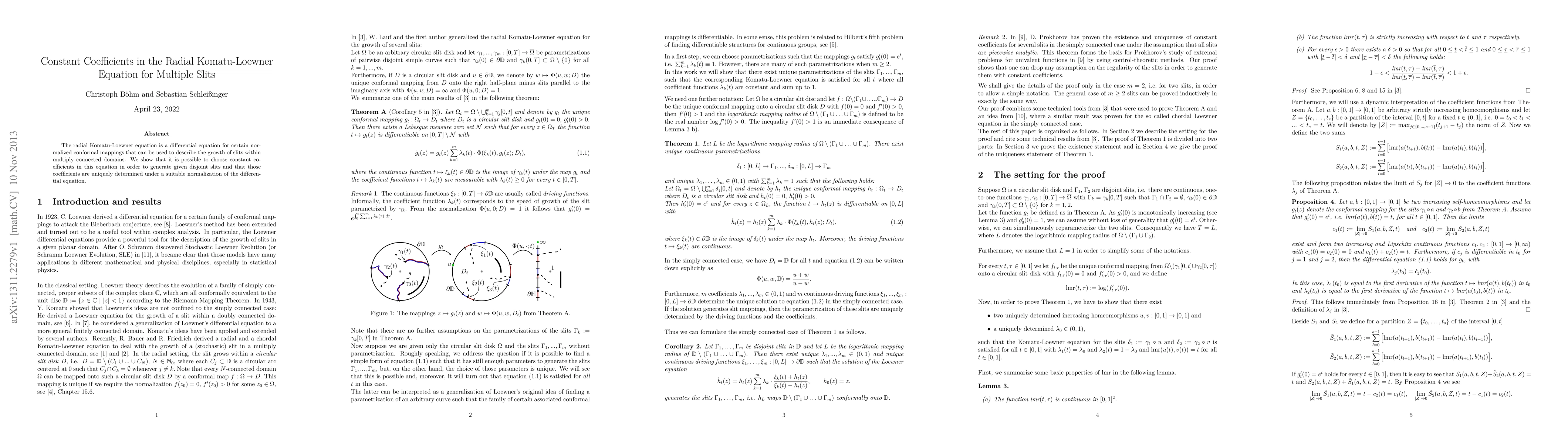 Researchers found that it is possible to choose constant coefficients in the radial Komatu-Loewner equation to generate specific slits within multiply connected domains, with those coefficients being uniquely determined under a suitable normalization.