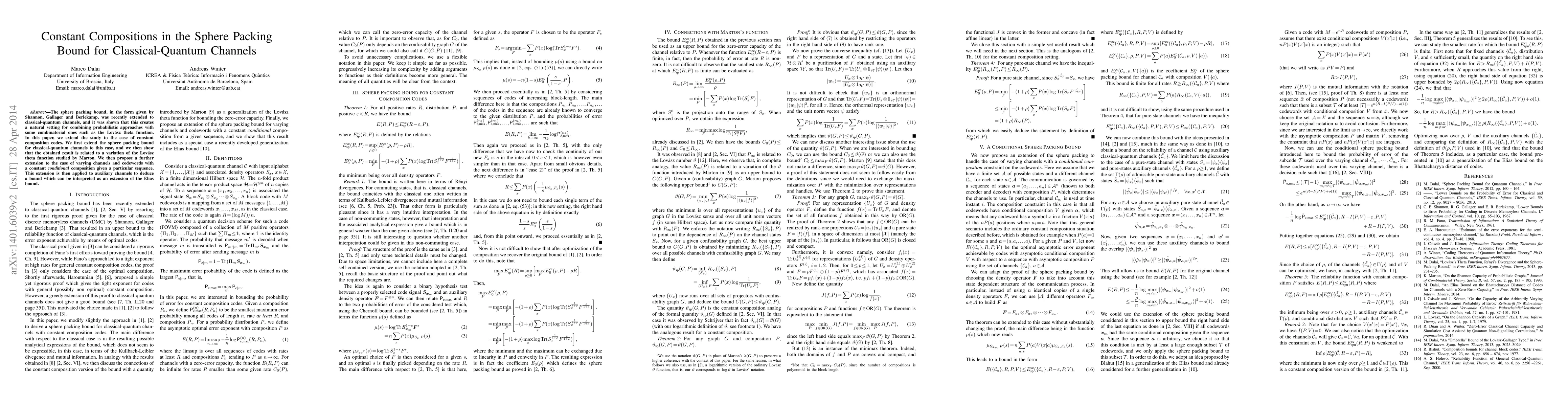 This paper extends the sphere packing bound for classical-quantum channels to constant composition codes, linking it to a variation of Marton's Lovasz theta function. It further proposes an extension for varying channels and codewords with a constant conditional composition, applying it to auxiliary channels to derive an extended Elias bound.