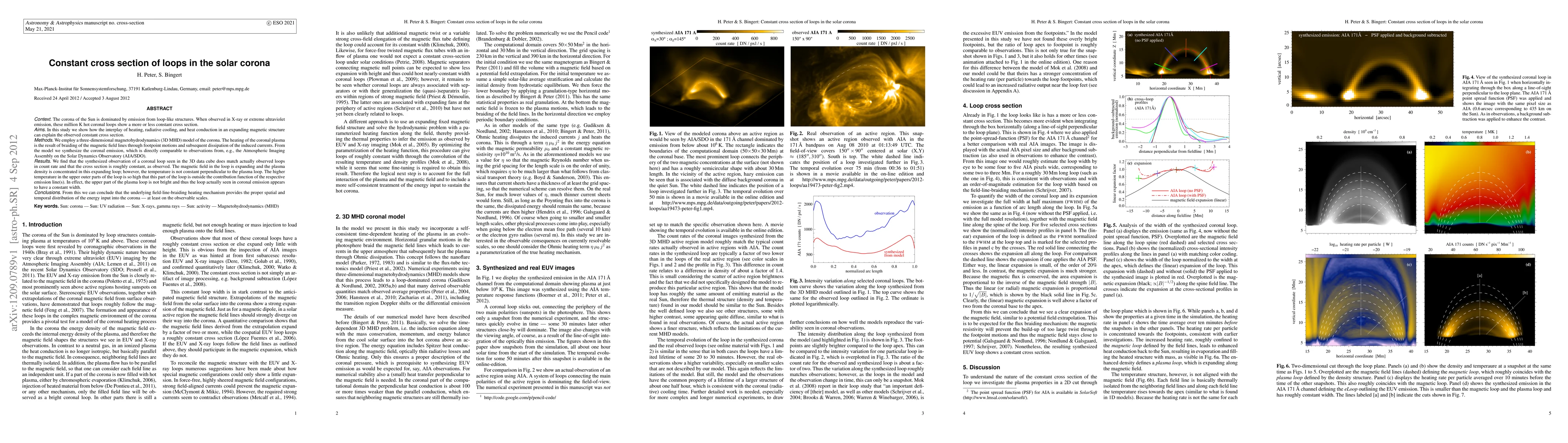 This study uses a 3D MHD model to demonstrate that the constant cross section of coronal loops in the solar corona results from the interplay of heating, radiative cooling, and heat conduction in an expanding magnetic structure. The model shows that the observed constant width is due to the upper part of the loop being too hot to contribute significantly to the emission, thus maintaining the apparent constant cross section.