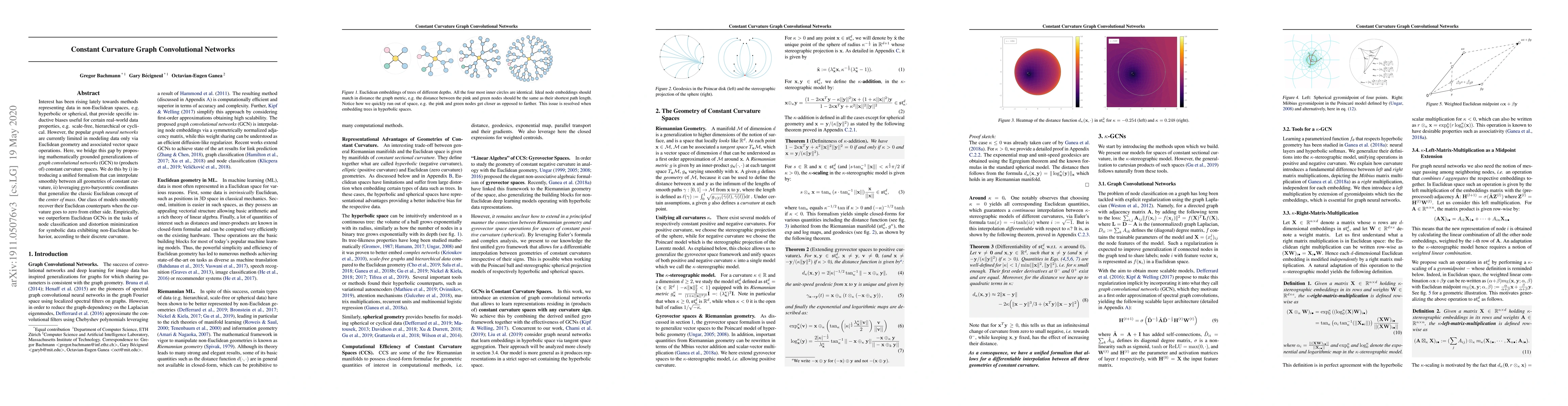 This paper proposes Constant Curvature Graph Convolutional Networks (CCGCN) to model data in non-Euclidean spaces like hyperbolic or spherical, which are better suited for specific real-world data properties. The method uses gyro-barycentric coordinates and smoothly interpolates between all constant curvature geometries, outperforming Euclidean GCNs in node classification and distortion minimization tasks for non-Euclidean data.