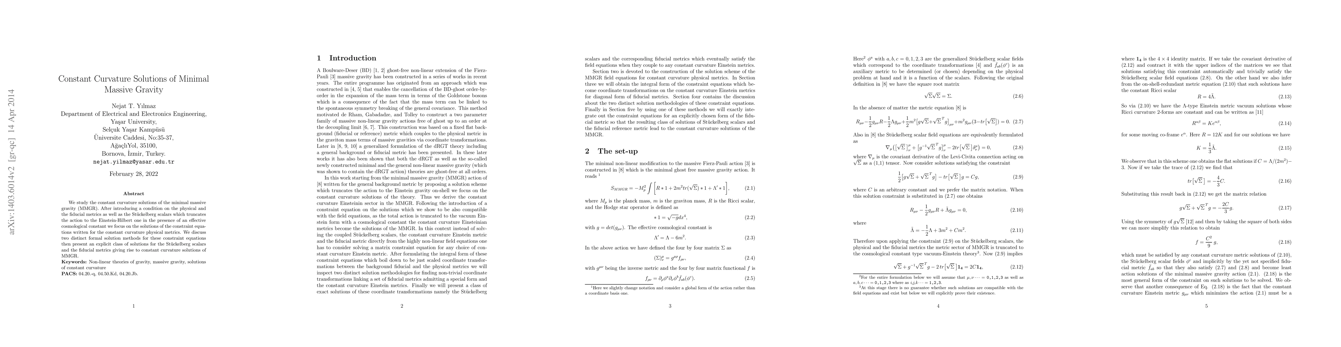 This paper explores constant curvature solutions in Minimal Massive Gravity (MMGR), introducing a condition that reduces the action to Einstein-Hilbert with an effective cosmological constant. It discusses two methods for solving constraint equations related to constant curvature physical metrics and presents an explicit class of solutions for Stuckelberg scalars and fiducial metrics.