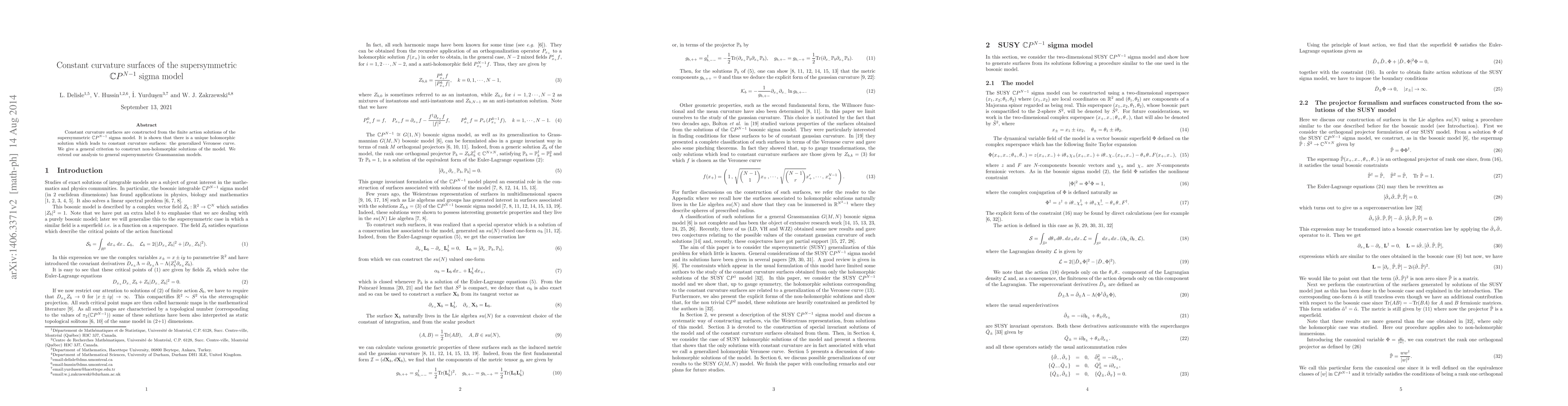 Constant curvature surfaces are constructed from the finite action solutions of the supersymmetric $\mathbb{C}P^{N-1}$ sigma model. It is shown that there is a unique holomorphic solution which leads to constant curvature surfaces: the generalized Veronese curve. We give a general criterion to construct non-holomorphic solutions of the model. We extend our analysis to general supersymmetric Grassmannian models.