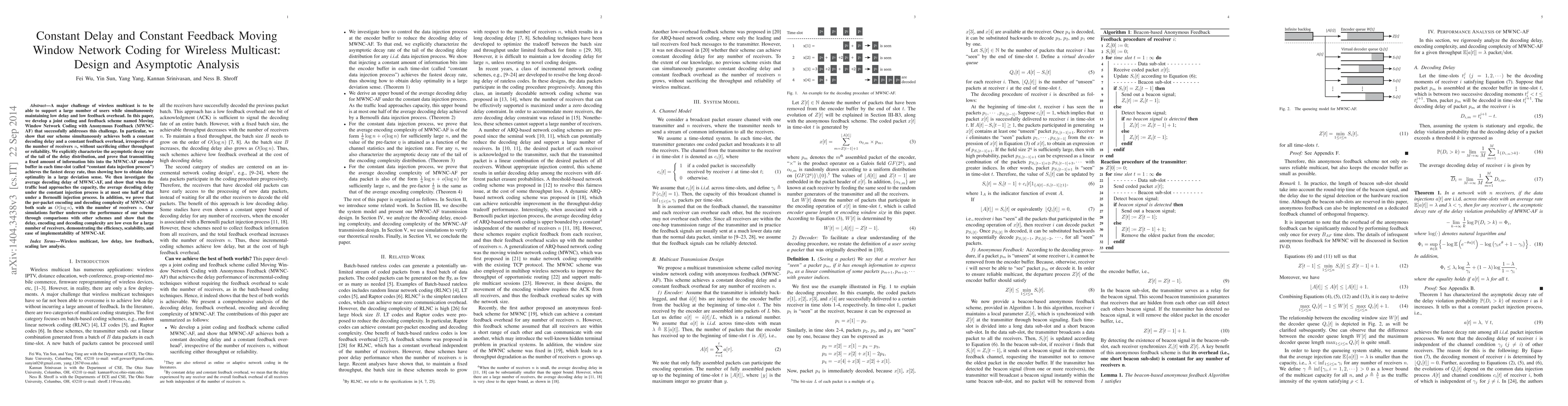 A major challenge of wireless multicast is to be able to support a large number of users while simultaneously maintaining low delay and low feedback overhead. In this paper, we develop a joint coding and feedback scheme named Moving Window Network Coding with Anonymous Feedback (MWNC-AF) that successfully addresses this challenge. In particular, we show that our scheme simultaneously achieves both a constant decoding delay and a constant feedback overhead, irrespective of the number of receivers $n$, without sacrificing either throughput or reliability. We explicitly characterize the asymptotic decay rate of the tail of the delay distribution, and prove that transmitting a fixed amount of information bits into the MWNC-AF encoder buffer in each time-slot (called "constant data injection process") achieves the fastest decay rate, thus showing how to obtain delay optimality in a large deviation sense. We then investigate the average decoding delay of MWNC-AF, and show that when the traffic load approaches the capacity, the average decoding delay under the constant injection process is at most one half of that under a Bernoulli injection process. In addition, we prove that the per-packet encoding and decoding complexity of MWNC-AF both scale as $O(\log n)$, with the number of receivers $n$. Our simulations further underscore the performance of our scheme through comparisons with other schemes and show that the delay, encoding and decoding complexity are low even for a large number of receivers, demonstrating the efficiency, scalability, and ease of implementability of MWNC-AF.