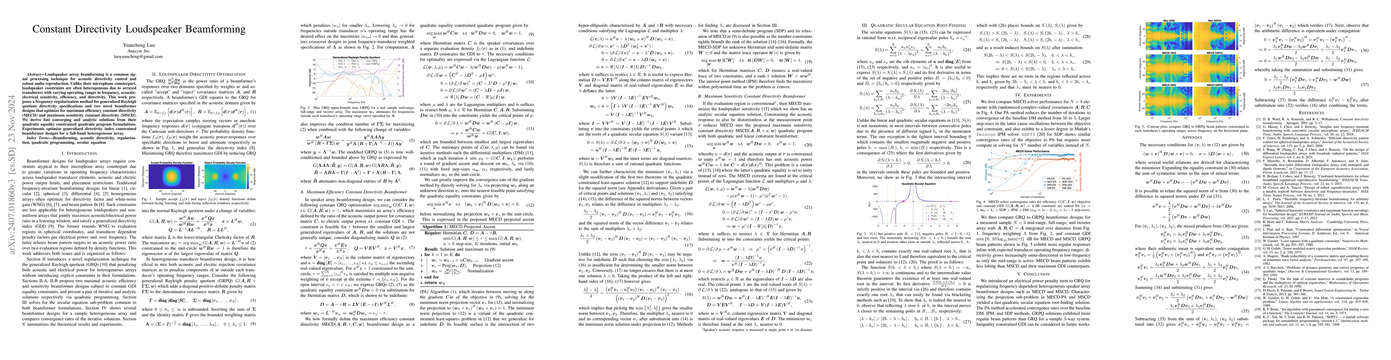This research proposes a frequency-regularization method and two novel beamformer designs—maximum efficiency constant directivity (MECD) and maximum sensitivity constant directivity (MSCD)—to optimize loudspeaker array beamforming for heterogeneous transducers. The method provides fast converging, analytic solutions to quadratic programming formulations.