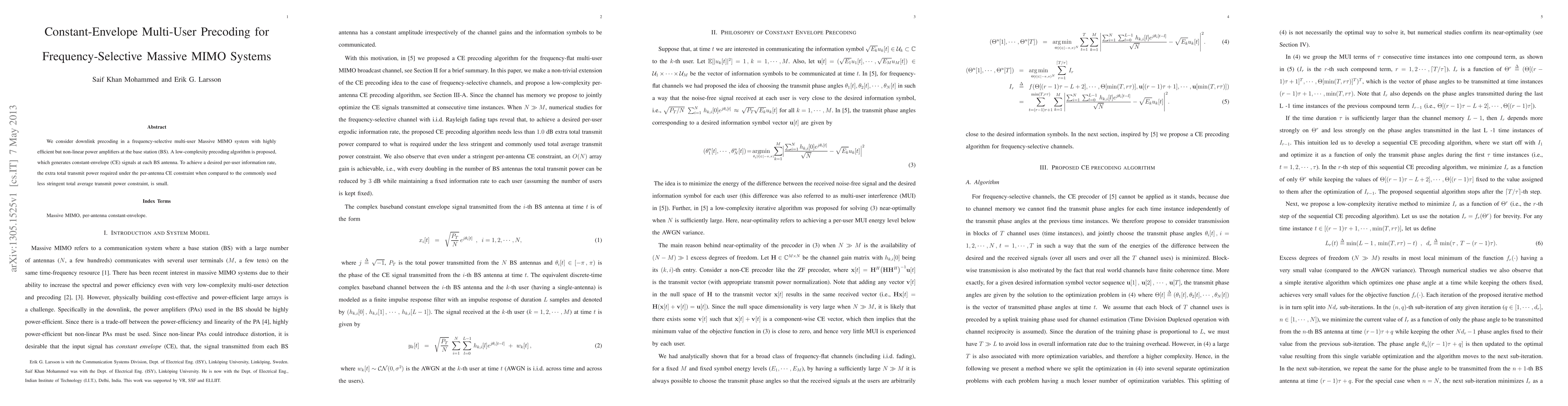 We consider downlink precoding in a frequency-selective multi-user Massive MIMO system with highly efficient but non-linear power amplifiers at the base station (BS). A low-complexity precoding algorithm is proposed, which generates constant-envelope (CE) signals at each BS antenna. To achieve a desired per-user information rate, the extra total transmit power required under the per-antenna CE constraint when compared to the commonly used less stringent total average transmit power constraint, is small.