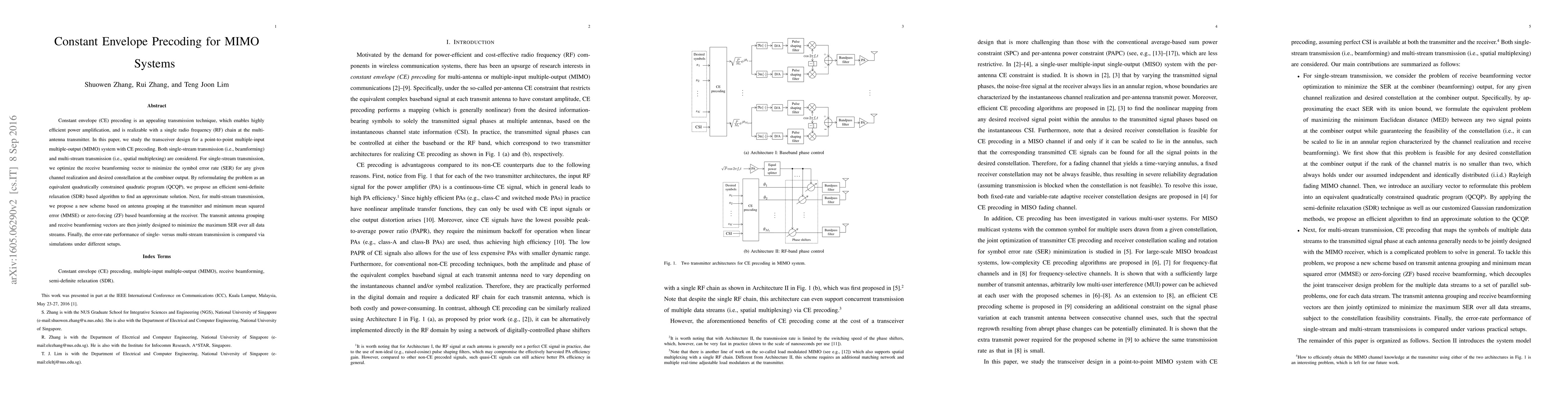 This paper proposes an efficient transmission technique called constant envelope precoding for MIMO systems, which enables highly efficient power amplification and achieves low error rates in both single-stream and multi-stream transmissions.