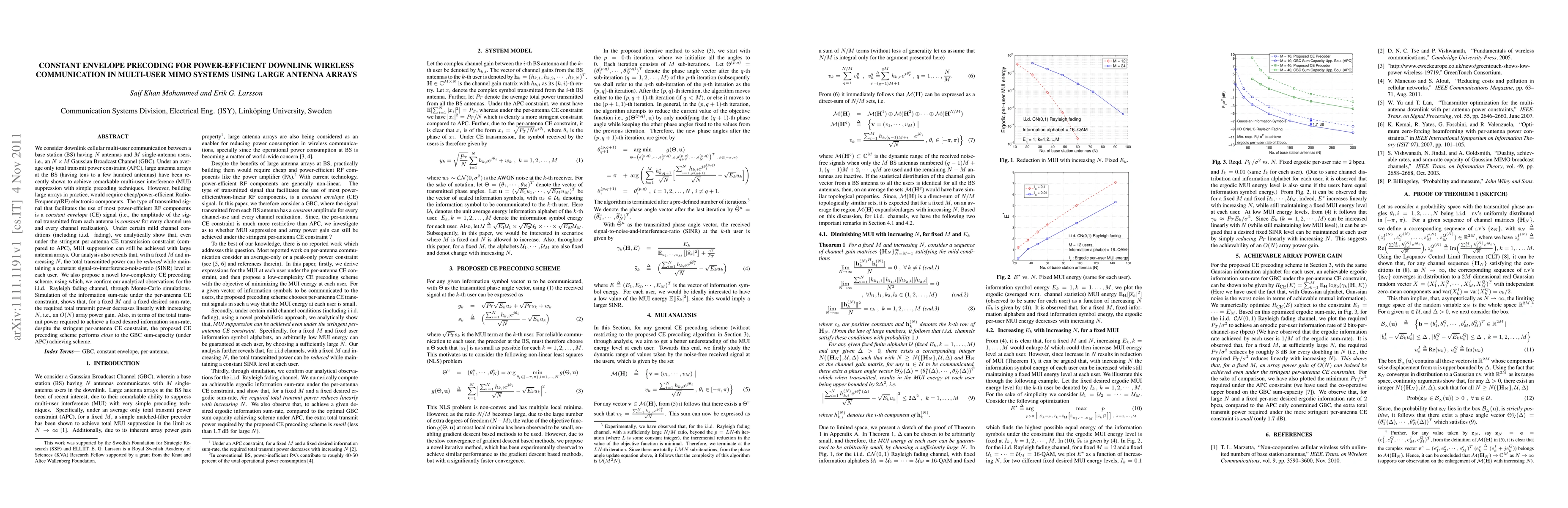 We consider downlink cellular multi-user communication between a base station (BS) having N antennas and M single-antenna users, i.e., an N X M Gaussian Broadcast Channel (GBC). Under an average only total transmit power constraint (APC), large antenna arrays at the BS (having tens to a few hundred antennas) have been recently shown to achieve remarkable multi-user interference (MUI) suppression with simple precoding techniques. However, building large arrays in practice, would require cheap/power-efficient Radio-Frequency(RF) electronic components. The type of transmitted signal that facilitates the use of most power-efficient RF components is a constant envelope (CE) signal. Under certain mild channel conditions (including i.i.d. fading), we analytically show that, even under the stringent per-antenna CE transmission constraint (compared to APC), MUI suppression can still be achieved with large antenna arrays. Our analysis also reveals that, with a fixed M and increasing N, the total transmitted power can be reduced while maintaining a constant signal-to-interference-noise-ratio (SINR) level at each user. We also propose a novel low-complexity CE precoding scheme, using which, we confirm our analytical observations for the i.i.d. Rayleigh fading channel, through Monte-Carlo simulations. Simulation of the information sum-rate under the per-antenna CE constraint, shows that, for a fixed M and a fixed desired sum-rate, the required total transmit power decreases linearly with increasing N, i.e., an O(N) array power gain. Also, in terms of the total transmit power required to achieve a fixed desired information sum-rate, despite the stringent per-antenna CE constraint, the proposed CE precoding scheme performs close to the GBC sum-capacity (under APC) achieving scheme.
