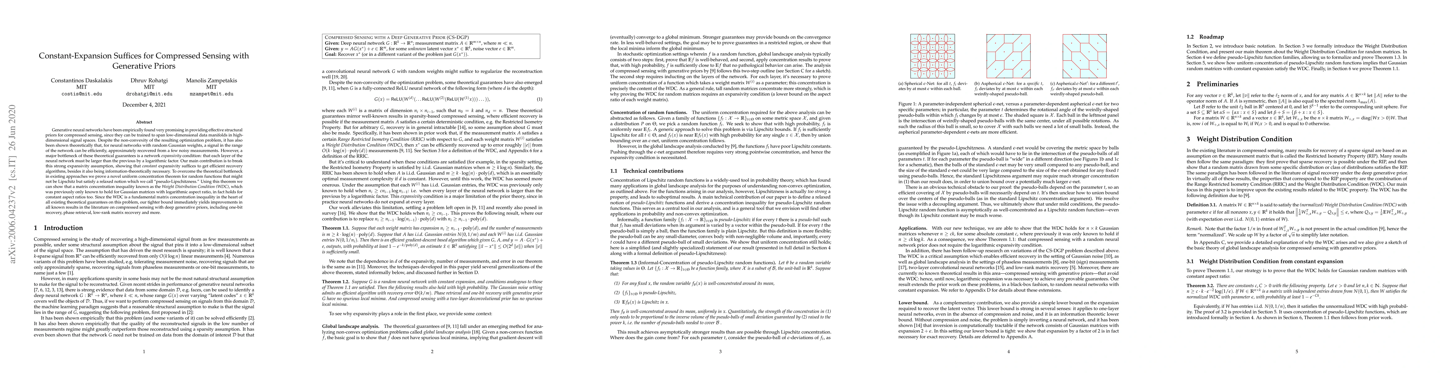 This paper demonstrates that constant-expansion neural networks, rather than the previously required logarithmically increasing expansion, can still efficiently recover signals from compressed sensing measurements. It introduces a novel concentration theorem to support this claim, extending the Weight Distribution Condition to constant aspect ratios, thus improving theoretical guarantees for compressed sensing with generative priors.