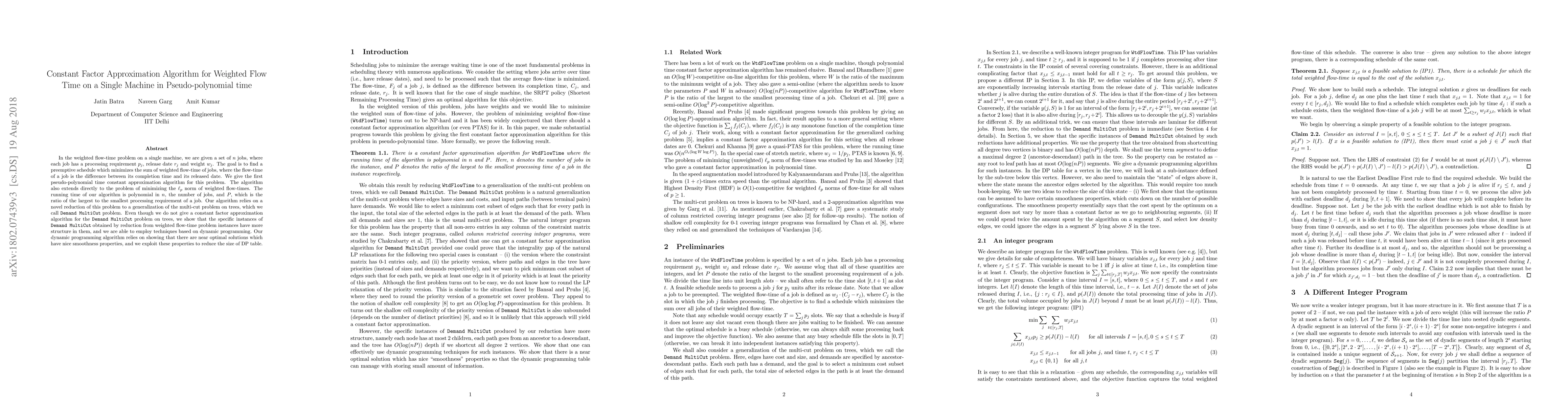 In the weighted flow-time problem on a single machine, we are given a set of n jobs, where each job has a processing requirement p_j, release date r_j and weight w_j. The goal is to find a preemptive schedule which minimizes the sum of weighted flow-time of jobs, where the flow-time of a job is the difference between its completion time and its released date. We give the first pseudo-polynomial time constant approximation algorithm for this problem. The running time of our algorithm is polynomial in n, the number of jobs, and P, which is the ratio of the largest to the smallest processing requirement of a job. Our algorithm relies on a novel reduction of this problem to a generalization of the multi-cut problem on trees, which we call the Demand Multi-Cut problem. Even though we do not give a constant factor approximation algorithm for the Demand Multi-Cut problem on trees, we show that the specific instances of Demand Multi-Cut obtained by reduction from weighted flow-time problem instances have more structure in them, and we are able to employ techniques based on dynamic programming. Our dynamic programming algorithm relies on showing that there are near optimal solutions which have nice smoothness properties, and we exploit these properties to reduce the size of DP table.