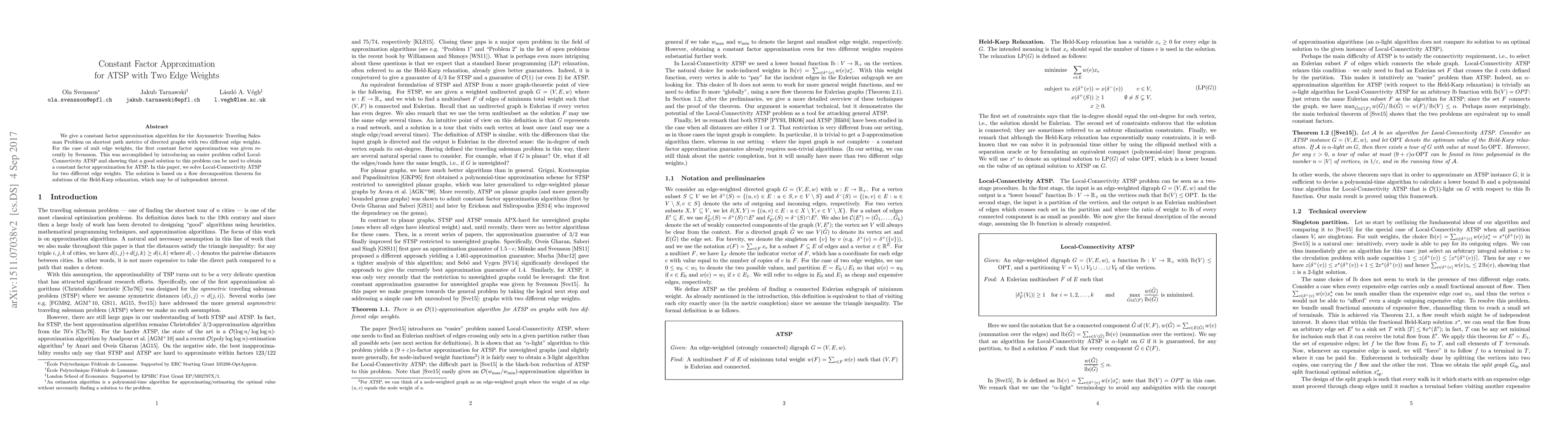This paper presents a constant factor approximation algorithm for the Asymmetric Traveling Salesman Problem (ATSP) on directed graphs with two distinct edge weights, extending previous results for unit edge weights. The solution leverages a flow decomposition theorem for Held-Karp relaxation solutions and addresses the Local-Connectivity ATSP.