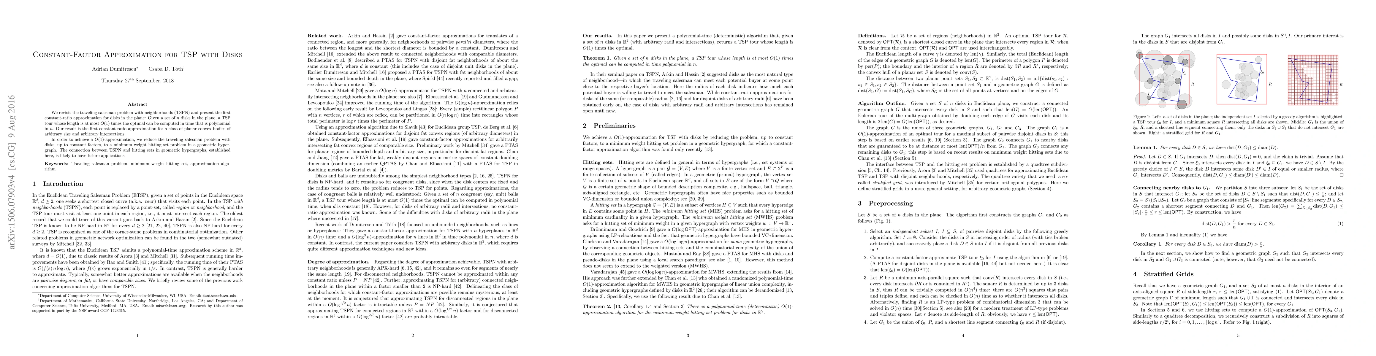 This paper presents the first constant-factor approximation algorithm for the traveling salesman problem with disks (TSPN), achieving a tour length within a constant factor of the optimal. The method reduces TSPN to a minimum weight hitting set problem in a geometric hypergraph, leveraging this connection for future applications.