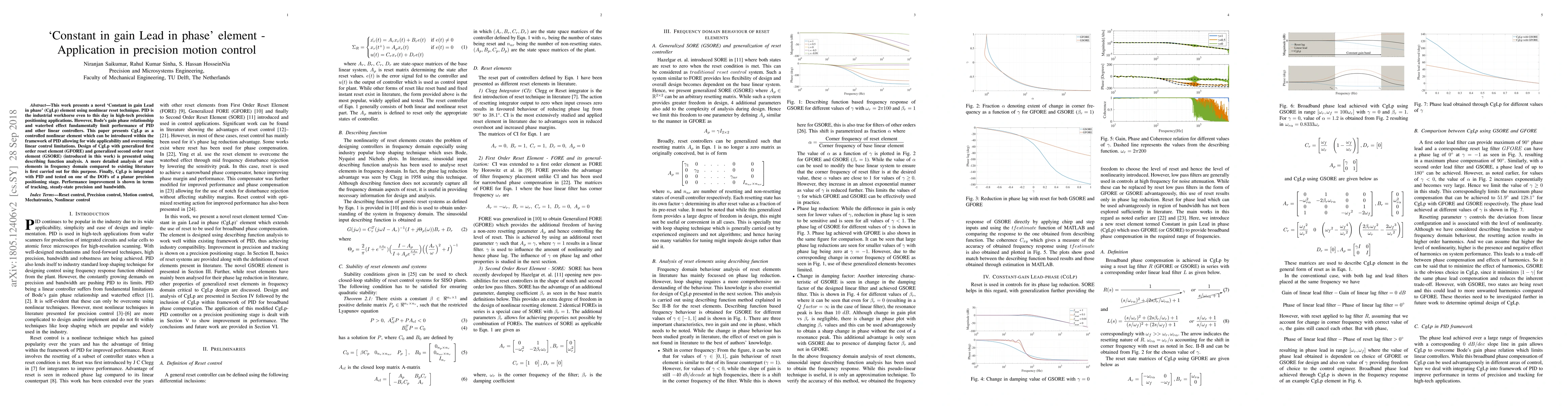 This paper introduces a novel 'Constant in gain Lead in phase' (CgLp) element using nonlinear reset techniques to enhance precision motion control in PID-based systems, demonstrating improved tracking, steady-state precision, and bandwidth. The CgLp element is designed with generalized reset elements and tested on a planar positioning stage.