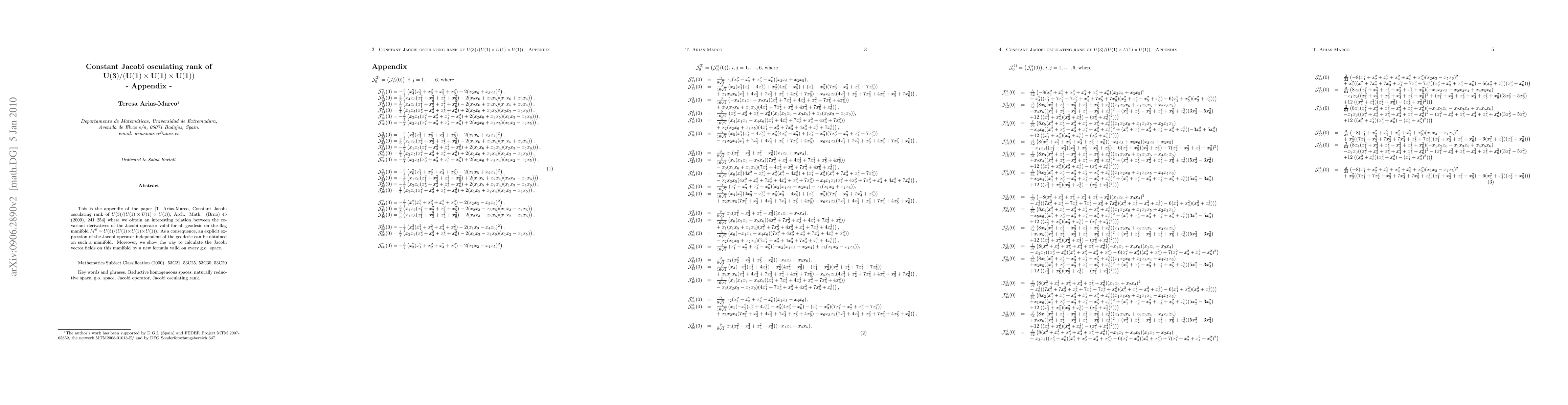 This appendix discusses the constant Jacobi osculating rank on the flag manifold $M^6=U(3)/(U(1) \times U(1) \times U(1))$, deriving a relation for covariant derivatives of the Jacobi operator applicable to all geodesics. It provides an explicit, geodesic-independent expression for the Jacobi operator and a new formula for calculating Jacobi vector fields on this manifold.