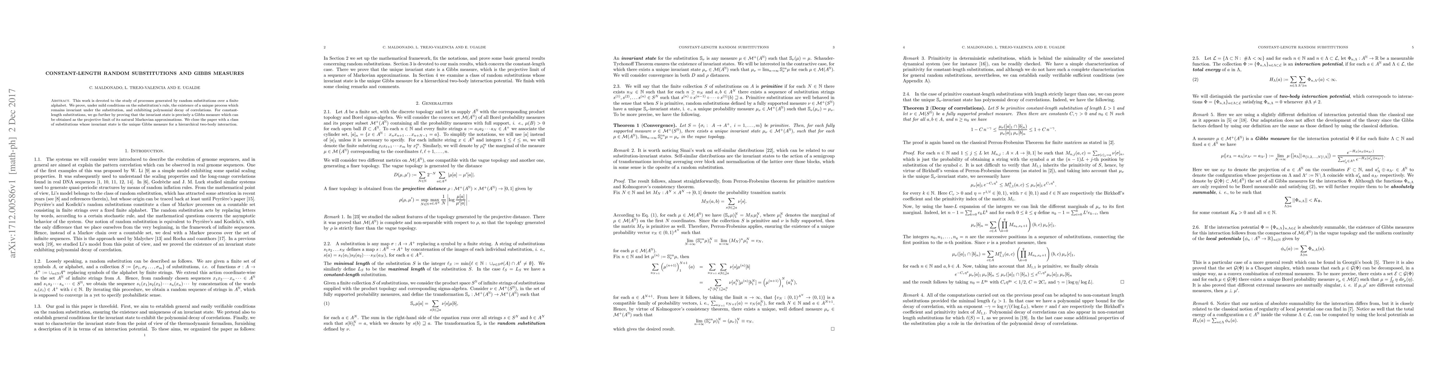 This paper proves the existence of a unique invariant Gibbs measure for constant-length random substitutions over a finite alphabet, showing polynomial decay of correlations and establishing a connection to hierarchical two-body interactions. The invariant state is shown to arise as the projective limit of Markovian approximations.