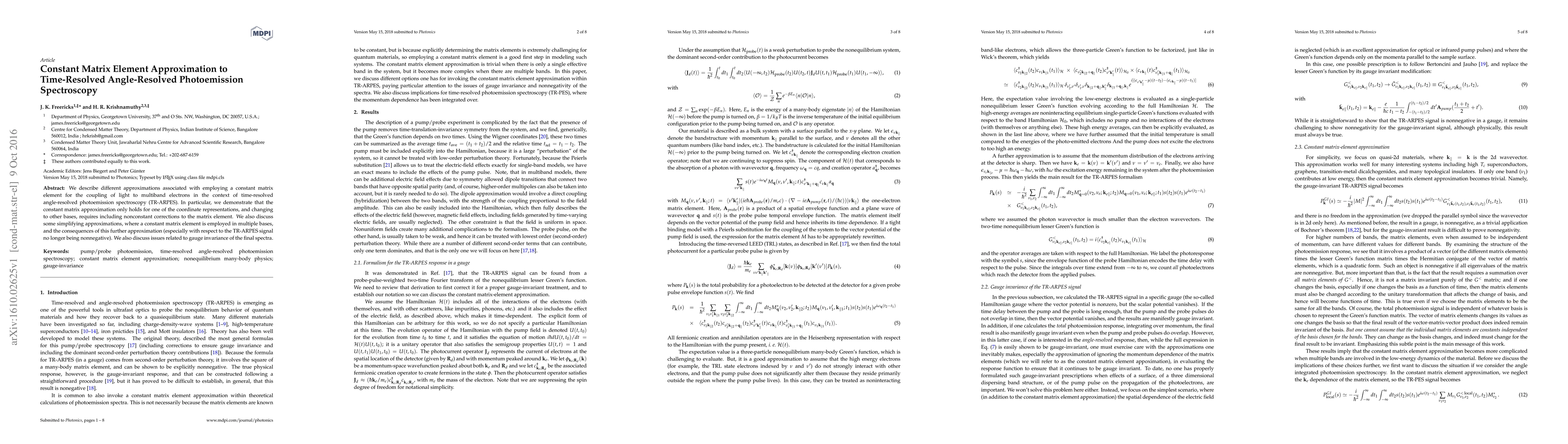 We describe different approximations associated with employing a constant matrix element for the coupling of light to multiband electrons in the context of time-resolved angle-resolved photoemission spectroscopy (TR-ARPES). In particular, we demonstrate that the constant matrix approximation only holds for one of the coordinate representations, and changing to other bases, requires including nonconstant corrections to the matrix element. We also discuss some simplifying approximations, where a constant matrix element is employed in multiple bases, and the consequences of this further approximation (especially with respect to the TR-ARPES signal no longer being nonnegative). We also discuss issues related to gauge invariance of the final spectra.