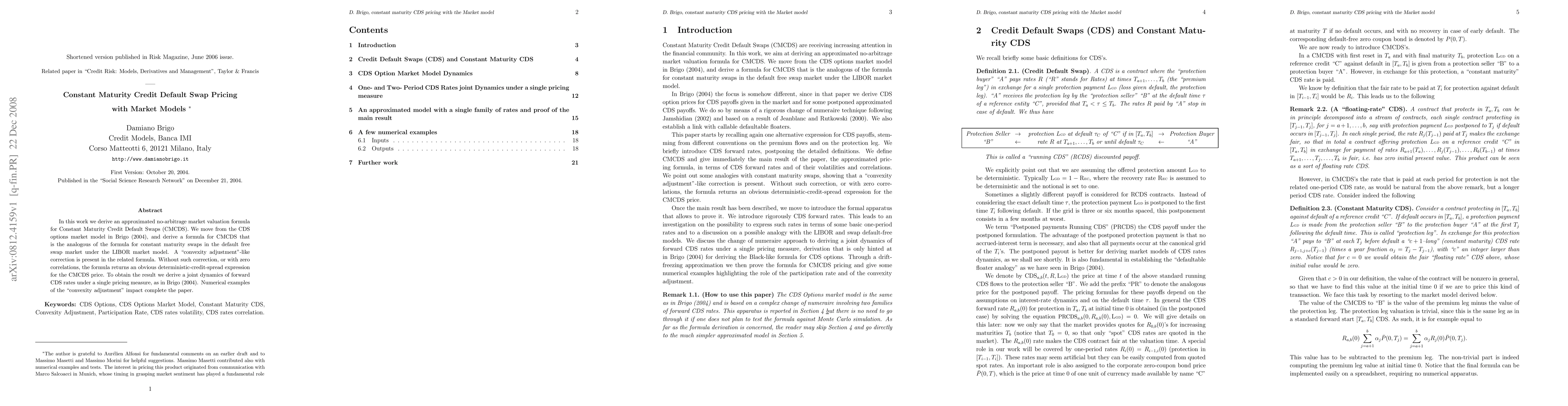 This paper derives an approximated no-arbitrage valuation formula for Constant Maturity Credit Default Swaps (CMCDS) using market models, analogous to constant maturity swaps in the default-free market. It introduces a "convexity adjustment" correction for accurate pricing, and concludes with numerical examples demonstrating its impact.