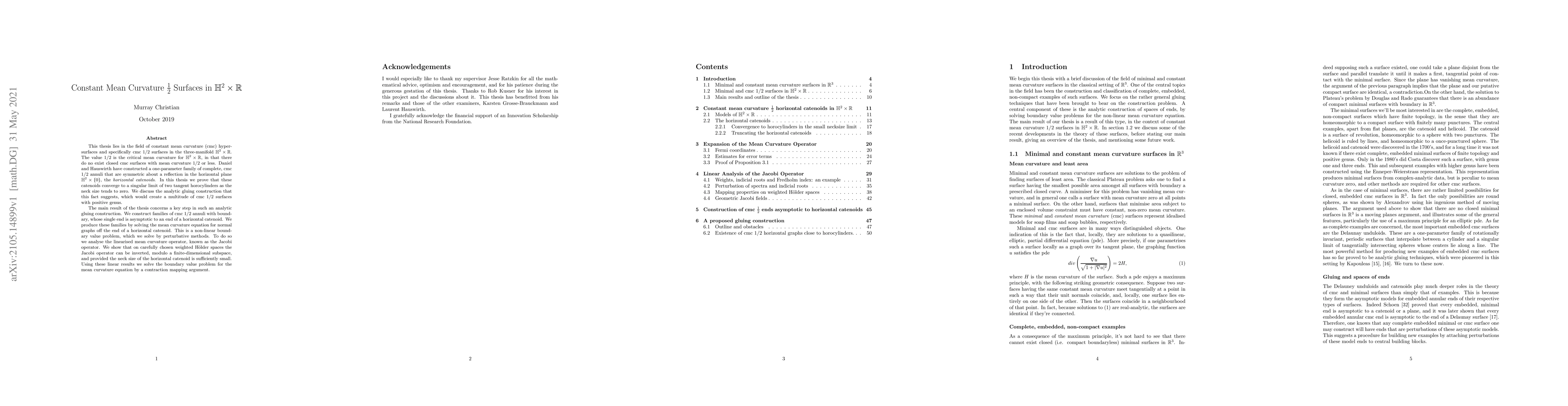 This thesis lies in the field of constant mean curvature (cmc) hypersurfaces and specifically cmc $1/2$ surfaces in the three-manifold $\mathbb{H}^2\times\mathbb{R}$. The value $1/2$ is the critical mean curvature for $\mathbb{H}^2\times\mathbb{R}$, in that there do no exist closed cmc surfaces with mean curvature $1/2$ or less. Daniel and Hauswirth have constructed a one-parameter family of complete, cmc $1/2$ annuli that are symmetric about a reflection in the horizontal plane $\mathbb{H}^2 \times \{0\}$, the horizontal catenoids. In this thesis we prove that these catenoids converge to a singular limit of two tangent horocylinders as the neck size tends to zero. We discuss the analytic gluing construction that this fact suggests, which would create a multitude of cmc $1/2$ surfaces with positive genus. The main result of the thesis concerns a key step in such an analytic gluing construction. We construct families of cmc $1/2$ annuli with boundary, whose single end is asymptotic to an end of a horizontal catenoid. We produce these families by solving the mean curvature equation for normal graphs off the end of a horizontal catenoid. This is a non-linear boundary value problem, which we solve by perturbative methods. To do so we analyse the linearised mean curvature operator, known as the Jacobi operator. We show that on carefully chosen weighted H\"older spaces the Jacobi operator can be inverted, modulo a finite-dimensional subspace, and provided the neck size of the horizontal catenoid is sufficiently small. Using these linear results we solve the boundary value problem for the mean curvature equation by a contraction mapping argument.