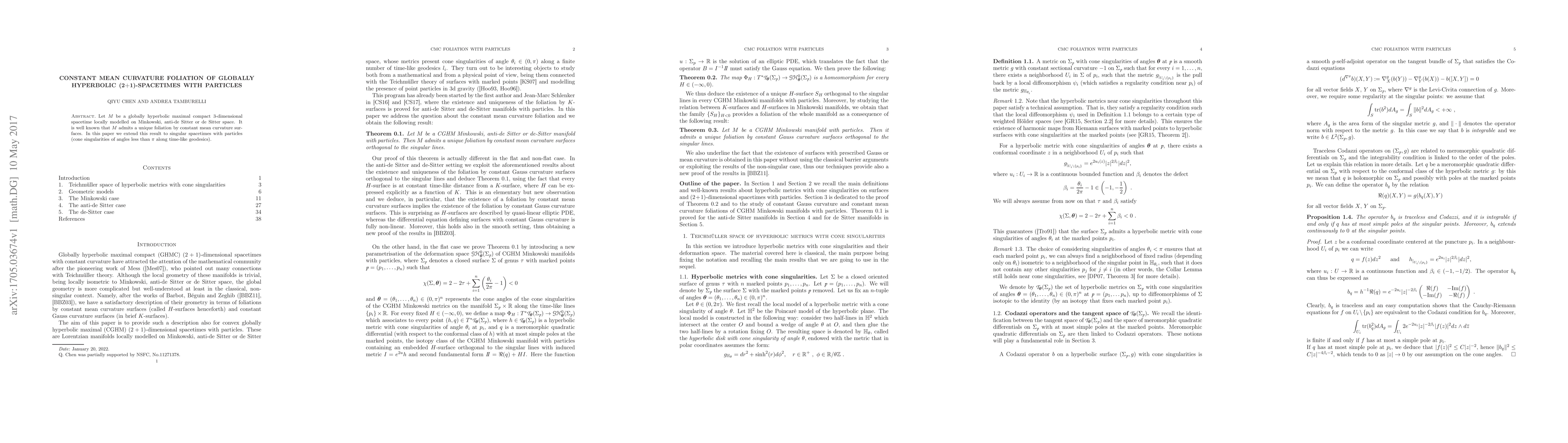 This paper extends the unique foliation by constant mean curvature surfaces to globally hyperbolic $(2+1)$-dimensional spacetimes with particles, including cone singularities of angles less than $\pi$ along time-like geodesics. The study focuses on spacetimes locally modeled on Minkowski, anti-de Sitter, or de Sitter space.