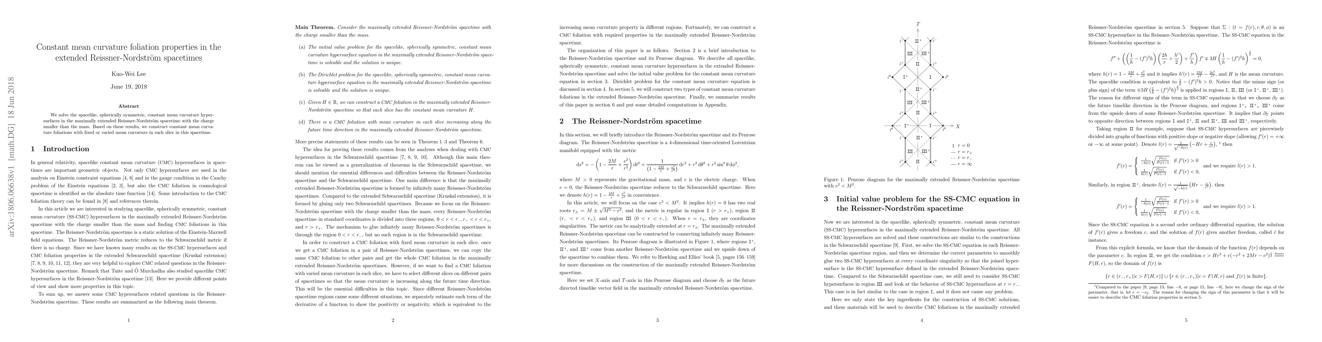 We solve the spacelike, spherically symmetric, constant mean curvature hypersurfaces in the maximally extended Reissner-Nordstrom spacetime with the charge smaller than the mass. Based on these results, we construct constant mean curvature foliations with fixed or varied mean curvature in each slice in this spacetime.