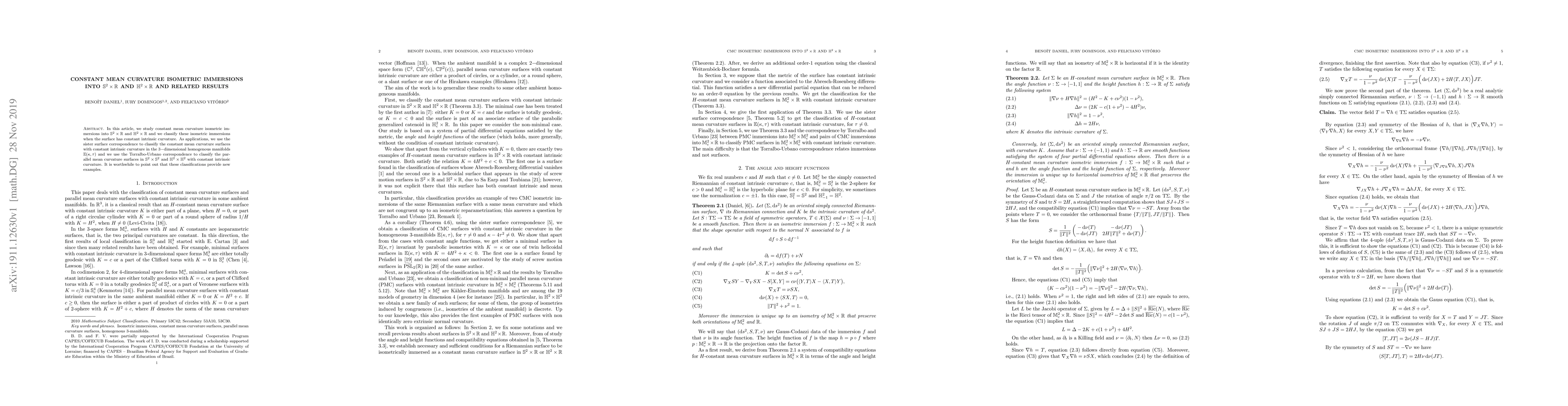 In this article, we study constant mean curvature isometric immersions into $\mathbb{S}^2 \times \mathbb{R}$ and $\mathbb{H}^2 \times \mathbb{R}$ and we classify these isometric immersions when the surface has constant intrinsic curvature. As applications, we use the sister surface correspondence to classify the constant mean curvature surfaces with constant intrinsic curvature in the $3-$dimensional homogenous manifolds $\mathbb{E}(\kappa, \tau)$ and we use the Torralbo-Urbano correspondence to classify the parallel mean curvature surfaces in $\mathbb{S}^2 \times \mathbb{S}^2$ and $\mathbb{H}^2 \times \mathbb{H}^2$ with constant intrinsic curvature. It is worthwhile to point out that these classifications provide new examples.