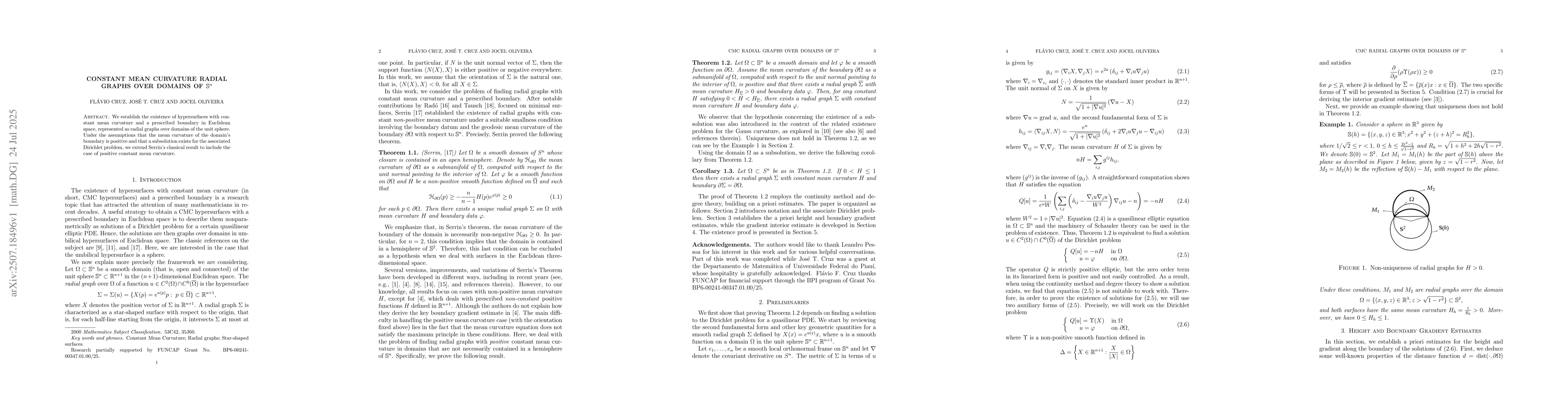 We establish the existence of hypersurfaces with constant mean curvature and a prescribed boundary in Euclidean space, represented as radial graphs over domains of the unit sphere. Under the assumptions that the mean curvature of the domain's boundary is positive and that a subsolution exists for the associated Dirichlet problem, we extend Serrin's classical result to include the case of positive constant mean curvature.