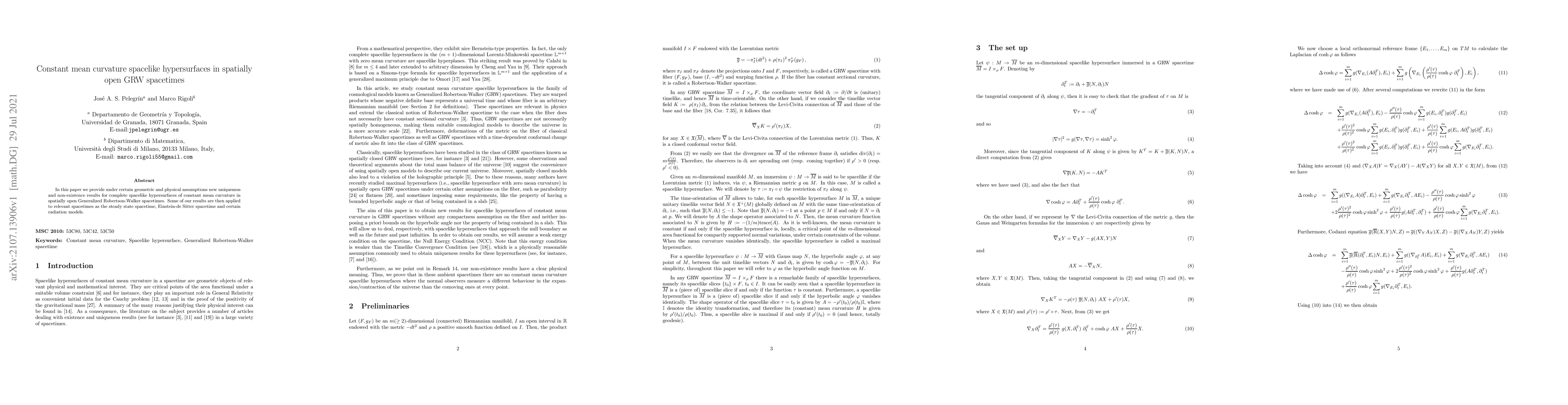 In this paper we provide under certain geometric and physical assumptions new uniqueness and non-existence results for complete spacelike hypersurfaces of constant mean curvature in spatially open Generalized Robertson-Walker spacetimes. Some of our results are then applied to relevant spacetimes as the steady state spacetime, Einstein-de Sitter spacetime and certain radiation models.