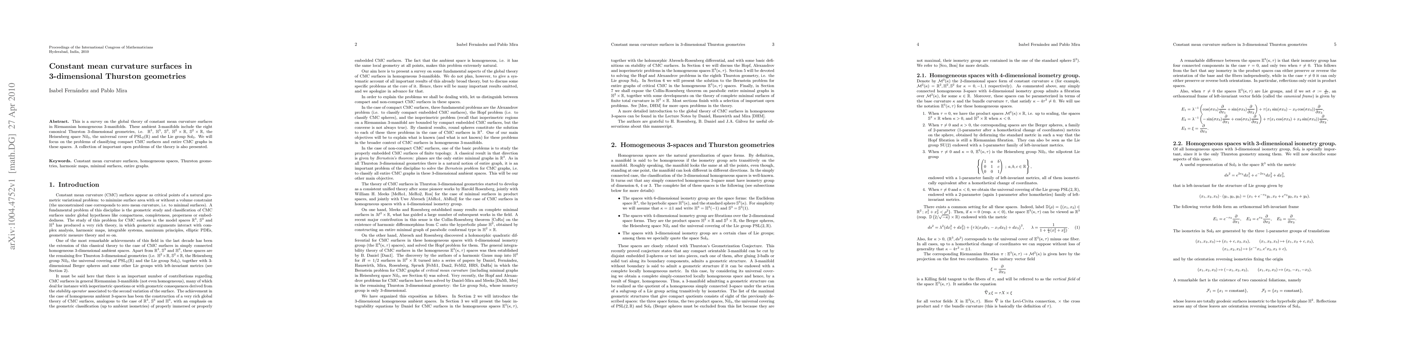 This paper surveys the global theory of constant mean curvature (CMC) surfaces in the eight canonical Thurston 3-manifolds, focusing on classifying compact CMC surfaces and entire CMC graphs, and presenting key open problems in the field.
