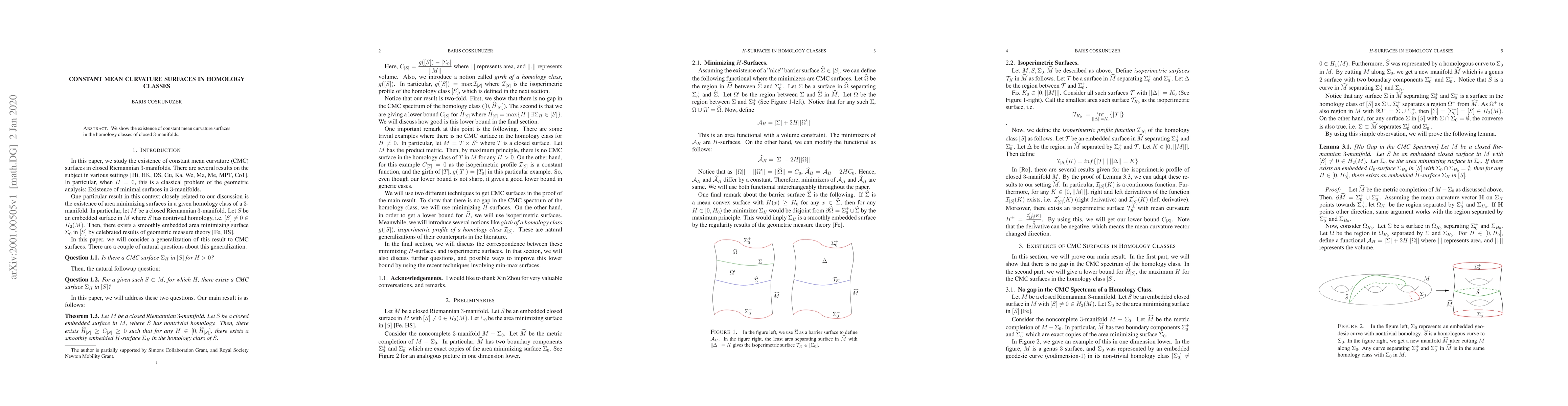 Summary: This paper proves the existence of constant mean curvature surfaces within specific homology classes of closed 3-manifolds, contributing to the understanding of geometric structures in topology.